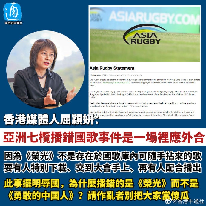 圖片製作:王瑤 香港媒體人屈穎妍14日在社交平台發文:下星期一,萬眾期待的世界盃足球賽在卡塔爾正式開鑼了,亞洲勁旅韓國一如過往,殺入了最後32強,第一場賽事,就是對戰南美足球強國烏拉圭。試想像,如果在比賽開場前的互奏國歌環節,韓國隊播出的國歌變成朝鮮國歌,你道,大家反應會如何?類似情況,11月13日在韓國仁川發生了,當地舉行的亞洲七人欖球系列賽第二站——香港對韓國的決賽中,竟出現播錯中國國歌的場面,而且那錯,是極離譜的張冠李戴,把2019年香港“黑暴”主題曲《願榮光歸香港》全首播出、全首播完!奇怪是,現場球員竟若無其事地肅立,場邊的港隊負責人亦沒有人跑去要求把歌曲腰斬,由得整首《榮光》播完,然後開始賽事,直至港隊在比賽中勝出,再有升區旗播國歌儀式,主辦方這才宣布,之前播錯歌並致歉。如果,港隊沒取勝呢?那主辦單位就連更正、道歉的機會都沒有了,全世界就會以為,《榮光》就是“香港之歌”。有人說,可能是無心之失。正常播錯國歌的無心之失,頂多是印度播錯了印尼。2019年9月的歐洲國家盃外圍賽,法國對阿爾巴尼亞賽事開場前,就誤把歐洲小國安道爾的國歌,當作阿爾巴尼亞國歌播出,直播鏡頭見球員表情錯愕,場上的阿爾巴尼亞球迷亦做出抗議手勢。結果,主辦當局立即重新播放正確國歌,事件令比賽延遲了7分鐘,歐洲足協紀律委員會向法國足協作出處分且罰款1萬歐元,並成立獨立調查委員會處理此事。所以,“無心之失”是會有的,但都是播錯別國國歌,而不可能播一首不是國歌,且是當地暴亂主題曲,那種“錯”,絕對絕對是“有心之作”。《榮光》不是一首存在於國歌庫內可隨手拈來的歌,要把這歌在世界比賽的鏡頭下直播,需要有人特別下載、然後交到大會手上、再有人配合播出,這當中需要一點裡應外合。行會成員湯家驊大律師說:“事件肯定不是無心之失,屬具犯罪意圖之行為……涉事者可能已干犯《刑事罪行條例》下之煽惑罪、香港國安法之分裂國家罪或勾結外國勢力罪、或串謀違反《國歌條例》罪。雖然現實上特區政府難以把在韓者繩之以法,但很難相信事件不涉及在港人士協助甚或策劃;特區政府應嚴肅細查,依法跟進而非只是表示抗議和要求道歉那麼簡單。”這場裡應外合,就是勾結外國勢力;把暴亂主題曲宣揚為“香港之歌”,就是分裂國家。“黃絲”Youtuber桑普拍片煽動說:“這事提醒我們,香港人在外面可以做好多事……就是要讓他們草木皆兵……”有人和應、有人鼓吹,煽惑罪已成。此事擺明辱國,為什麼播錯的是《榮光》而不是《勇敢的中國人》? 請作亂者別把大家當傻瓜。 國恥大,還是獎杯大?主辦方若不認真交代,香港隊就退出餘下比賽,贊助商也該終止所有贊助。特區政府請別再只是“非常不滿”和“嚴厲譴責”,如果今次又再姑息,不由國安處開file調查,不以國安法為懲治基礎,這種試探、這種踩紅線行為,將陸續有來,將愈玩愈大。 【編輯:汪彥希】