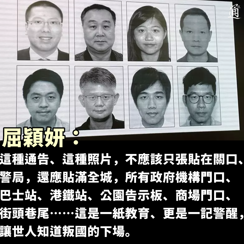 屈穎妍:叛國不是玩泥沙,下場可以牽連甚廣,這是國際標準!香港新聞網7月24日電 香港警方國安處早前懸紅各100萬元(港幣,下同),通緝包括羅冠聰、郭榮鏗在內的8名國安逃犯。羅冠聰、郭榮鏗及蒙兆達的家人被警方國安處帶走調查。近日,香港媒體人屈穎妍發文感慨,叛國不是玩泥沙,下場可以牽連甚廣,這是國際標準,放諸四海皆一樣。這8個通緝犯,就是人辦,相信這種調查只是開始。全文如下: 警方公布全球通緝8名國安嫌疑犯,很多被遺忘的2019暴亂記憶又再湧現眼前。日前通緝犯羅冠聰、郭榮鏗及蒙兆達的家人被警方國安處帶走調查,大家都說:終於等到今日。 善有善報,惡有惡報,若然未報,時辰未到。2019年黑暴時,香港好多人咬牙切齒、敢怒不敢言,大家都說:公義在哪裡?正邪為什麼沒了界線?是非黑白何以全被顛倒? 4年後的今天,時辰終於到了。 那天赴深圳,在關口看到八大通緝犯的照片,忽然覺得,香港政府實在太善良。 這種通告、這種照片,不應該只張貼在關口、警局,還應貼滿全城,所有政府機構門口、巴士站、港鐵站、公園告示板、商場門口、街頭巷尾……這是一紙教育、更是一記警醒,讓世人知道叛國的下場。