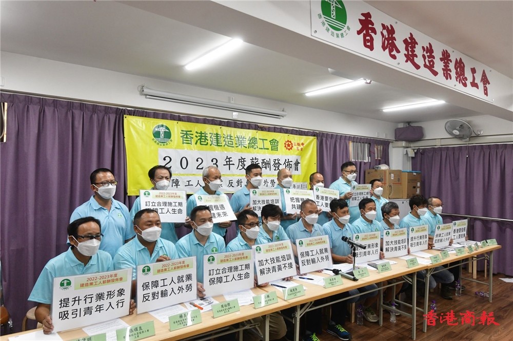 香港建造業總工會提出行業訴求 圖源:香港商報 有別於以往15個工種,工會今年納入鋁質工為新工種。明年薪酬調整中,16個工種中有12個工種的日薪將有提升,上升幅度由3%至12.5%不等。當中坭水工人的建議加幅最高,由去年的日薪1600元升至1800元,加幅達12.5%;天花間隔工人建議加幅12%,日薪將升至1400元;混凝土、紮鐡和挖掘機3項工種則維持不變。