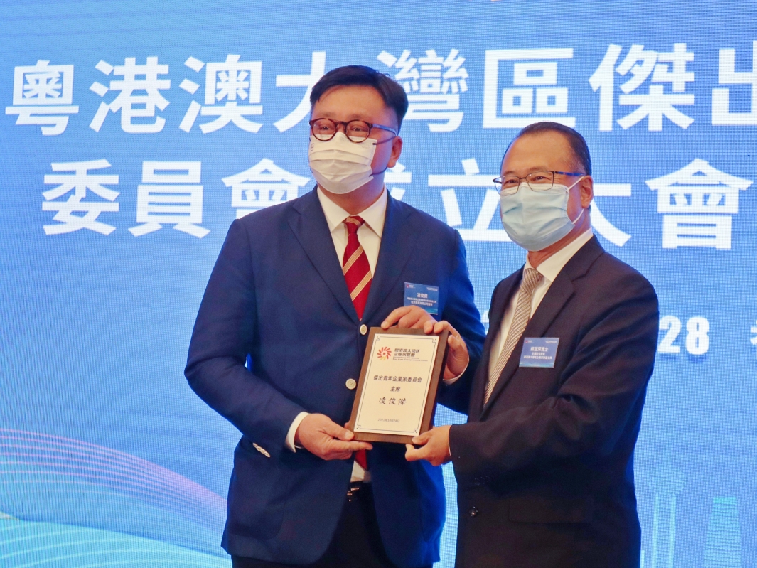 蔡冠深(右)頒授委任狀予凌俊傑。 圖源:香港商報 粵港澳大灣區企業家聯盟 (聯盟) 旗下的傑出青年企業家委員會經過兩年醞釀成立,粵港澳大灣區傑出青年企業家委員會副主席為葉長春、蔡加敏、鍾學勇、蔡捷思、陳少山、陳詩婷。他們都是粵港澳成功的青年領袖,在不同的行業均取得令人矚目的成就。知識產權委員會主任蔡關穎琴任名譽顧問。