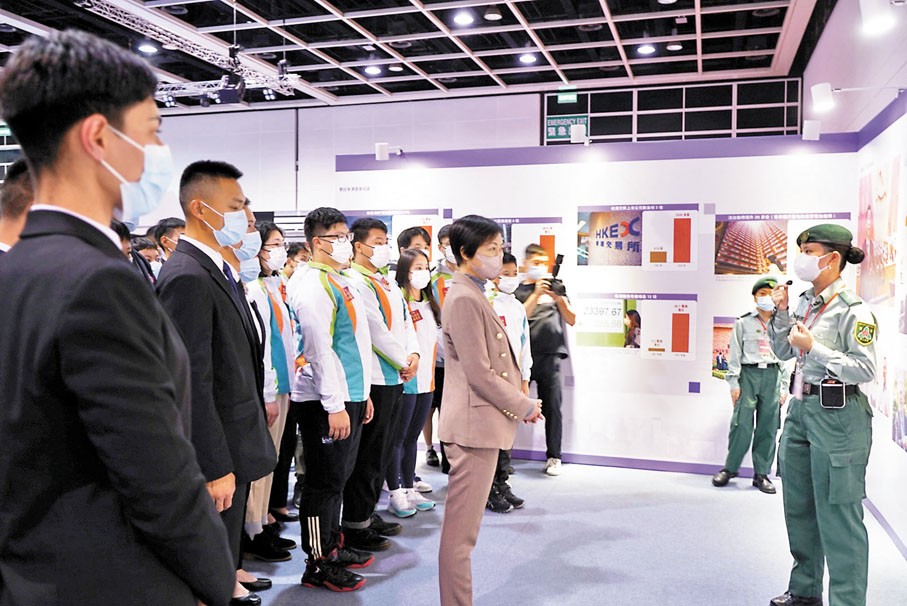 海關百位新入職學員在海關助理關長帶領下前往參觀。大公文匯全媒體供圖 昨日前來觀展的還有多間駐港中資企業和社團,包括中國電力國際發展有限公司、中國太平保險、上海浦東發展銀行股份有限公司香港分行、興業銀行香港分行、中國移動(香港)、中國光大集團、香港中國企業協會、香港中旅集團職工聯誼會、香港華僑華人研究中心、青年團體“龍騰志青”等。