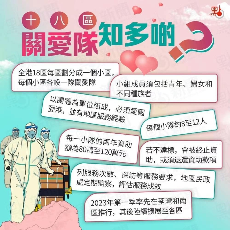 關愛隊政策 圖源:點新聞 政府會把每區劃分成不同小區,每小區設立一隊“關愛隊”小隊。荃灣會分為19個小區;南區分為17個小區。“關愛隊”小隊以團體為單位組成,團體須通過遴選成為“關愛隊”小隊。 遴選工作分為兩個階段,包括團體甄選和服務建議書評審。第一階段會評審申請團體的服務/舉辦活動的經驗、地區網絡和動員能力等。 第二階段會由通過評審的團體,因應地區民政事務處為各小區訂定的關鍵績效指標,提交服務建議書。通過兩個階段遴選的團體會成為小區的“關愛隊”小隊。 兩個階段的遴選工作將由民政及青年事務局局長領導的“全港關愛隊評審及督導小組”,以及民政事務專員領導的“地區關愛隊評審及統籌小組”負責,以確保遴選程序透明公正。 有興趣報名的團體須於明年1月9日或之前,遞交申請表和所需文件到荃灣或南區民政事務處。政府會參考荃灣和南區的經驗,陸續在其餘地區成立“關愛隊”。 政府會參考荃灣和南區的經驗,陸續在其餘地區成立“關愛隊”。 【編輯:王軼南】