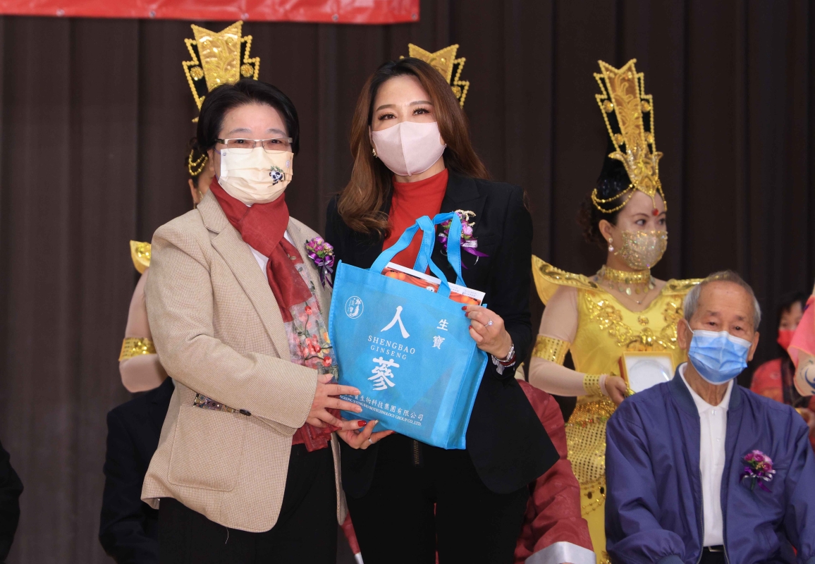 香港生寶生物科技有限公司董事蔡燕珊(右)向大會贈送人參營養產品,香港中泰盛大投資集團董事長/中印環球文化藝術研究院院長林梅香女士接受。