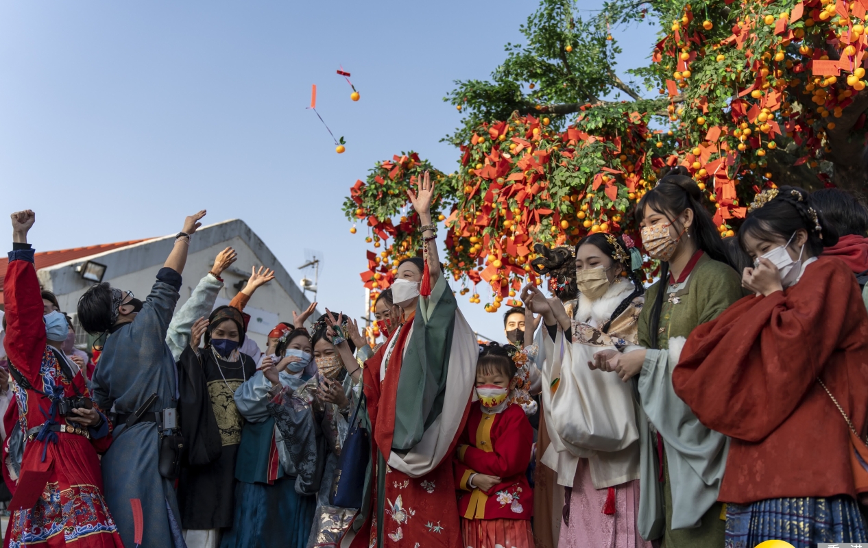 眾多市民前往林村許願樹拋寶碟祈願。圖源:香港文匯報 “丹青承南”社團成立於2019年,“丹”寓意赤子之心,“青”代表純粹,“承”寓意承傳,“南”則代表嶺南之南的香港,社長吳淑英寄望社團保持赤子之心,純粹推廣漢服及中華民族文化,無畏艱難,堅持不懈。吳淑英深耕漢服製作、刺繡及纏花技藝多年,她表示,“林村許願節”作為本港最受歡迎的新春祈福活動之一,能夠有幸參與深感榮幸,“是次活動既能凝聚『同袍』力量展示喜愛的漢服,亦能讓本港市民認識中華民族的傳統服飾,相信有助加深市民對自己民族和歷史的了解,是建立歷史自信、民族意識的一個重要契機。” “丹青承南”理事長田杰熱愛運動,平日運動時常着短衫上陣,今次他選擇英姿勃發的宋制戎裝參與活動。他指出,是次活動有賴林村及全港“同袍”鼎力支持,同時感激林村的信任,讓“丹青承南”負責策劃及籌組是次活動。他認為:“香港過去三年受疫情所困,社會氣氛不佳,期望是次活動能夠為林村,乃至為香港向海內外宣傳香港傳統文化及漢服文化,為社會增添一分『喜』色,與全港市民一同喜迎兔年。” 活動尾聲時,是次參與活動的“同袍”一同拋寶牒祈願,藉此祝願祖國及香港國泰民安、風調雨順,並祝願香港社會盡快復甦,重現活力、生機與朝氣。 (完) 【編輯:王軼南】