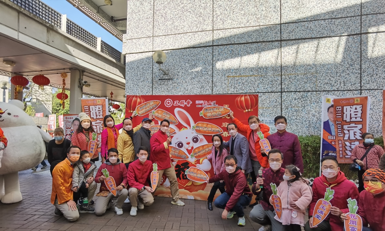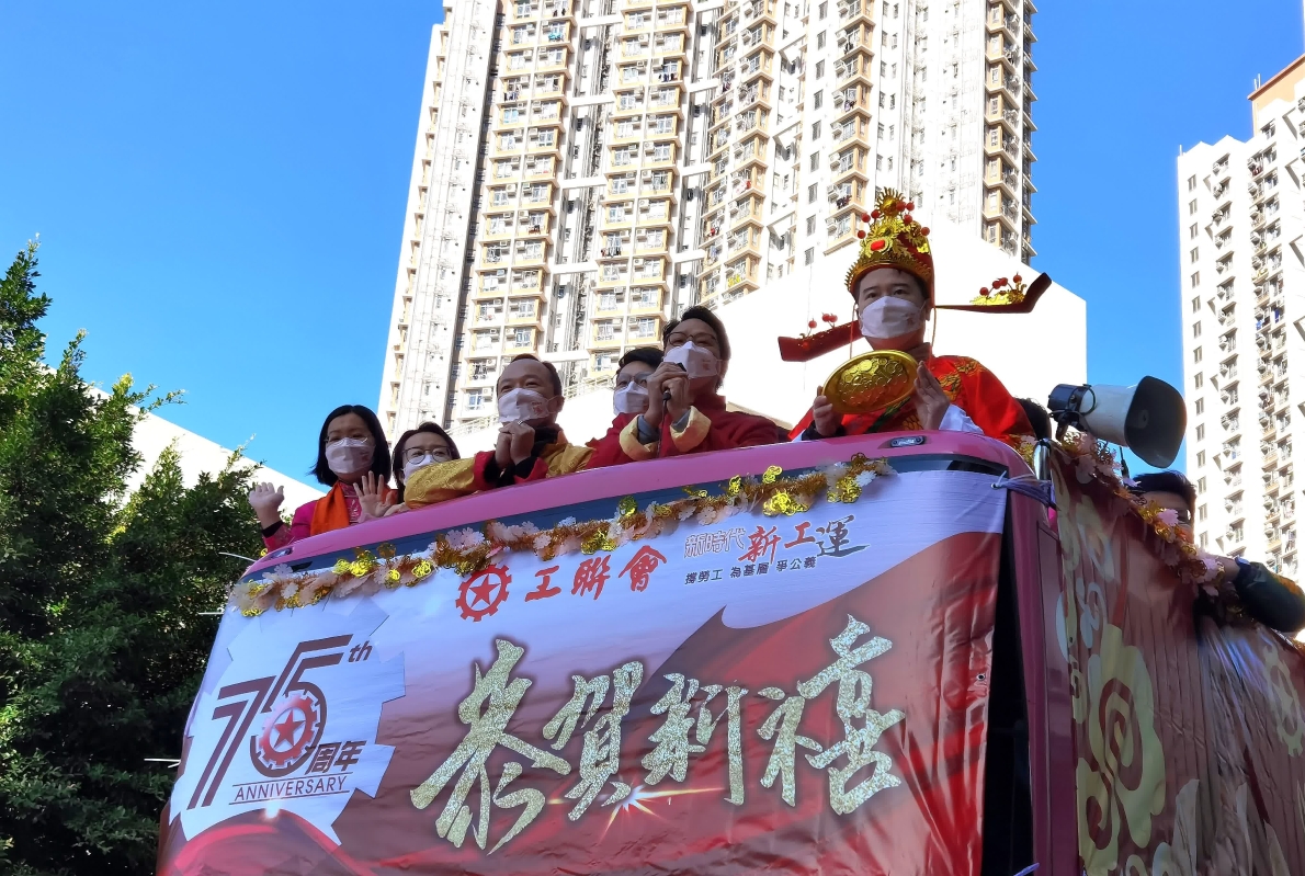 工聯會九龍東團隊辦花車巡遊。圖源:香港文匯網 登車前,工聯會秘書長馬光如、工聯會立法會議員鄧家彪、工聯會九龍東辦事處主任司徒建華、工聯會觀塘地區服務處主任、觀塘區議員簡銘東、觀塘區議會副主席呂東孩、九龍社團聯會觀塘地區委員會副主任鄭強峰、觀塘區議員龐智笙、工聯會黃大仙地區服務處主任譚美普、工聯會黃大仙地區服務處社區主任莫建榮等人出席在油麗邨康麗樓前舉辦的花車巡遊啟動儀式,並向附近居民派發新春利是。