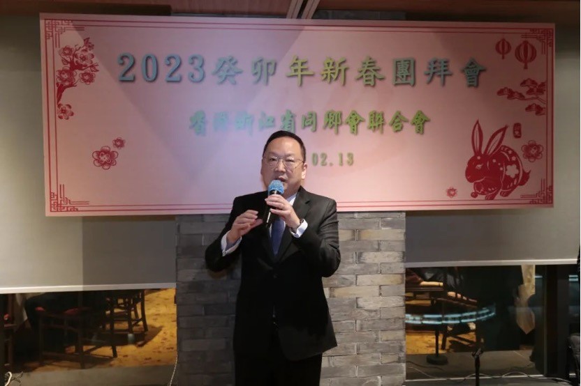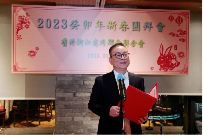 香港新聞網2月16日電 香港浙江省同鄉會聯合會日前於灣仔浙江軒舉辦癸卯年新春團拜晚宴。出席的主要嘉賓中聯辦社團聯絡部部長鍾吉昌、浙江省委統戰部常務副部長徐旭、中聯辦協調部副部長徐小林、中聯辦社團政團處處長何啟歡、浙江省委統戰部港澳台處處長周曉勇、富春有限公司董事總經理翁昌榮,與浙聯會永遠名譽會長李德麟、詹耀良及會長陳仲尼等百餘名理事會員歡聚一堂,共慶新春,場面喜慶熱鬧。