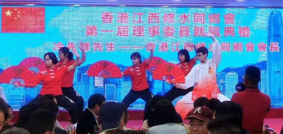 香港江西修水同鄉會第一屆理事委員就職典禮暨春茗聯歡會上的武術表演。 修水縣位於江西省九江市下轄縣,地處幕阜山與九嶺山山脈之間。是(贛、湘、鄂)三省,九縣的交界處;三個省會城市(長沙、武漢、南昌)的中心點,自然地理形成眾星拱月之勢。修水縣,古號“分寧”,國史有上望之稱,是江西省面積最大和九江市人口最多的縣,是九江市域副中心城市。是著名的革命老區:中國工農革命軍第一面軍旗在這里設計、製作并率先昇起,秋收起義第一槍在這里打響。秋收起義修水紀念館被授名為全國愛國主義教育基地,2004年被評為江西省“十大紅色景點”。 【編輯:洪少葵】