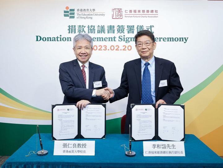 香港教大校長張仁良與仁善福來社執行副社長李和協簽署捐款協議。圖源:香港教大 教大校長張仁良教授感謝仁善福來慈善總社的鼎力支持。他說:“仁善福來慈善總社一直熱心公益,繼早前捐助本校的長者學苑開辦課程後,今次再次慷慨襄助,支持教大與泉師的交流協作。我們期望可與泉州的同儕分享經驗,為當地的教師培訓及研究出一分力。” 仁善福來慈善總社執行副社長李和協表示:很高興代表仁善福來慈善總社社長及創辦人、著名企業家和慈善家陳守仁參加活動。教大以培育未來教師爲核心使命,而泉師則是國家海外華文的教育基地,多年來孕育無數優秀專業的良師。我們深盼透過雙方的緊密協作,擴闊兩地師生的眼界及體驗,達至教學相長。 李和協介紹說,仁善福來社是因應新冠疫情於2020年成立的。新冠疫情爆發後,陳守仁從名下參與內地脫貧攻堅事業的 “仁善扶貧基金會”基金中撥出三千萬元成立仁善福來社。近三年來,仁善福來社開展了一系列以長者爲主要對象的服務項目。例如,在北角會所設立中醫診所,並與香港浸會大學中醫藥學院合作,舉辦中醫知識講座。向鐘聲慈善社捐款30萬元,此外,還開展了給社區長者送寒衣、送福袋、送盒飯,舉辦特賣場、發放優惠購物卡等項目。去年11月,仁善福來慈善總社也為教育大學的“長者學苑”作捐助。 “相信香港教大與泉州師院的交流合作,將給雙方帶來一加一大於二的效果”。李和協繼表示,仁善福來慈善總社還將向福建泉州師範學院捐助100萬人民幣,支持香港教大與泉州師院的協作。(完) 【編輯:王軼南】
