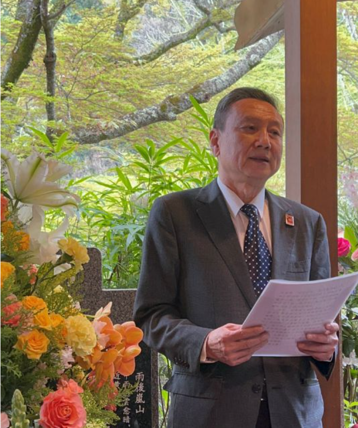駐日本大阪總領館總領事薛劍致辭。圖源:粵港澳大灣區青年總會 當日活動在嵐山大悲閣千光寺舉行,先由前日本首相福田康夫的代表讀出賀信,再由中華人民共和國駐日本大阪總領館總領事薛劍致辭。薛劍指出,大阪總領館、日本友人與遠道而來的中國嘉賓等共聚於此,共同瞻仰詩碑,希望大家能繼承和發揚周恩來總理等老一輩領導人的優良傳統,踔厲奮發、篤行不怠,為國家、為人民拼搏奉獻,在新時代新征程上留下無悔的奮鬥足跡。中日兩國未來應接續友好合作的使命,更堅定、更有力地開闢未來的發展前景。
