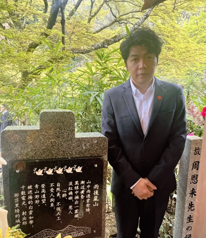 周恩來後人周秉和致辭。圖源:粵港澳大灣區青年總會 周恩來總理後人周秉和致辭時指出,今日在京都櫻花盛開的美麗時節,來到嵐山大悲閣千光寺,作為周恩來總理後人出席本次紀念活動,讓他滿懷激動心情。周總理生前對中日關係非常重視,正是他不斷克服障礙,打破僵局,推動中日關係向前發展,才最終實現了中日邦交正常化。當初周總理所撰詩作至今已逾百年,我們一路從嵐山走來,深切感受到他當年“為中華之崛起而讀書”的心路歷程,身心得以陶冶。希望通過本次活動,祝福中日兩國友誼長存。