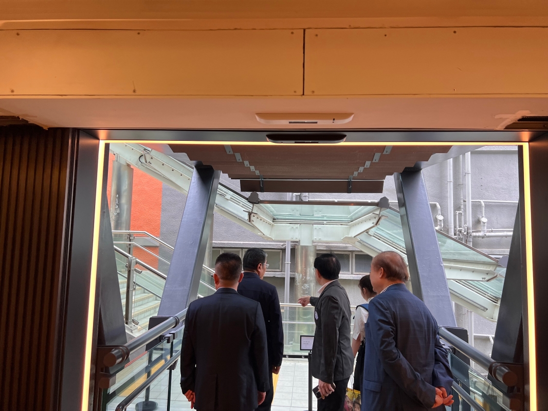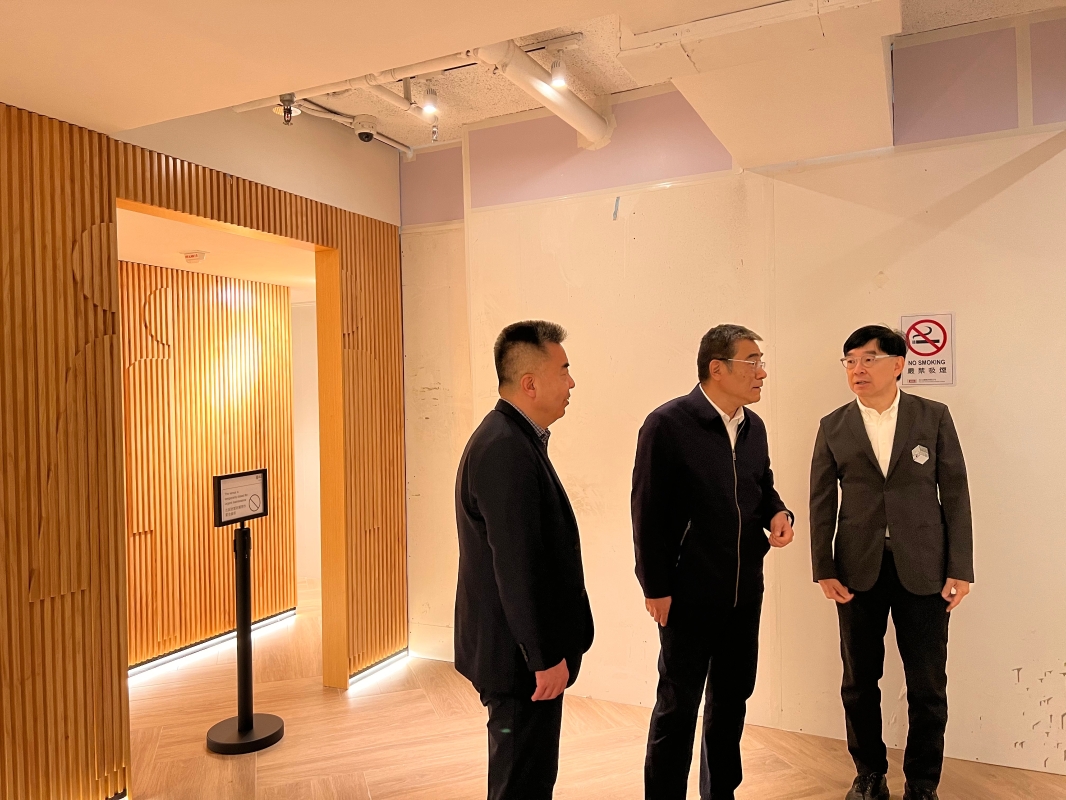 哈爾濱經開區招商領導小組副組長關和東(中)在香港經貿商會會長李秀恆(右)帶領下, 參觀在建工廈活化項目。香港中通社圖 李秀恆介紹稱,偉晉中心樓齡40餘年,由金寶集團於20年前購入,是區內唯一港鐵上蓋的工廈,區位優勢明顯。活化工程將把偉晉中心兩座工廈分別打造為一幢23層高的商務辦公大樓(約9萬平方呎),及一幢24層高的四星級酒店(139間客房)。