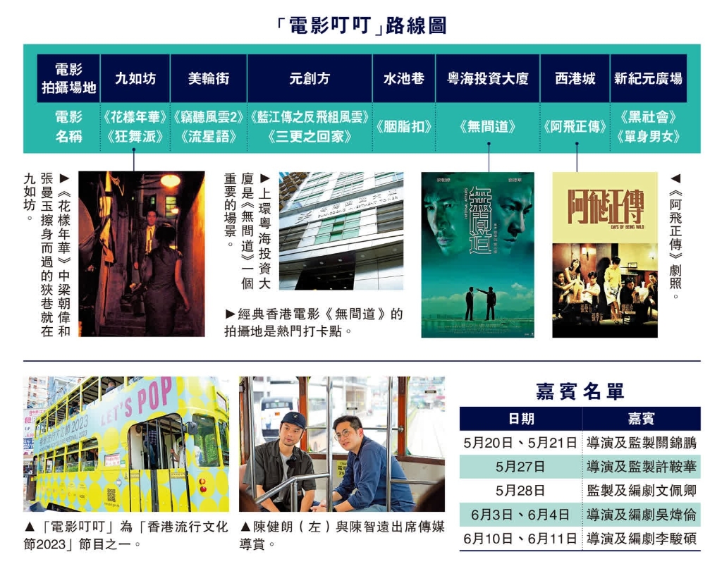 “電影叮叮”路線圖。圖源:文匯網 香港導演及演員陳健朗、“活現香港”創辦人陳智遠以及康文署總經理(流行文化)林覺聲昨日帶領傳媒導賞。據其介紹,“電影叮叮”活動帶領參加者走訪眾多香港經典電影的拍攝場地,包括九如坊、美輪街、元創方、水池巷、西港城等,尋找電影《胭脂扣》《藍江傳之反飛組風雲》《花樣年華》《無間道》《三更之回家》《狂舞派》等的拍攝場景。參加者可以在粵海投資大廈看到電影《無間道》中,陳永仁(梁朝偉飾)見證其上司墮樓砸車身亡的地點;欣賞到與《阿飛正傳》中如出一轍的紅色電話亭;親身到訪《胭脂扣》的取景地水池巷,亦可以在電車空間中,感受如《胭脂扣》等電影故事發生的場景,與導賞員一同尋找光影裏的瑰寶。