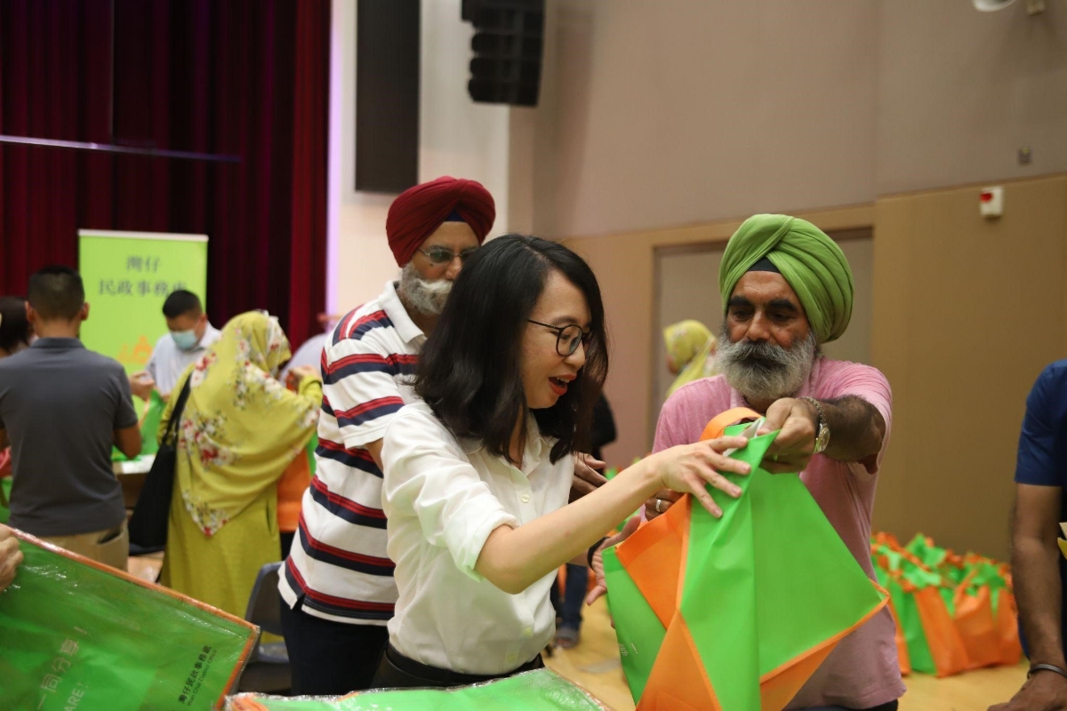 灣仔民政事務專員張雁伶與少數族裔義工一同包裝福袋。 6月9日,灣仔隨即舉行“慶回歸關懷送暖行動”啟動禮。灣仔民政事務專員張雁伶在致辭時指,最近社會上發生發多令人感到心痛的事件,暴力不能解決問題,只會令更多人陷於傷痛之中,頻生的憾事同時反映社區內有不少需要關懷及幫忙的家庭,但各界在有需要時一呼百應、眾志成城,很快便能組織起今次的送暖行動。她又指,關懷送暖行動並非一次性,而是未來地區治理的重點工作之一,民政事務處將會繼續致力組織不同的社區關懷行動。