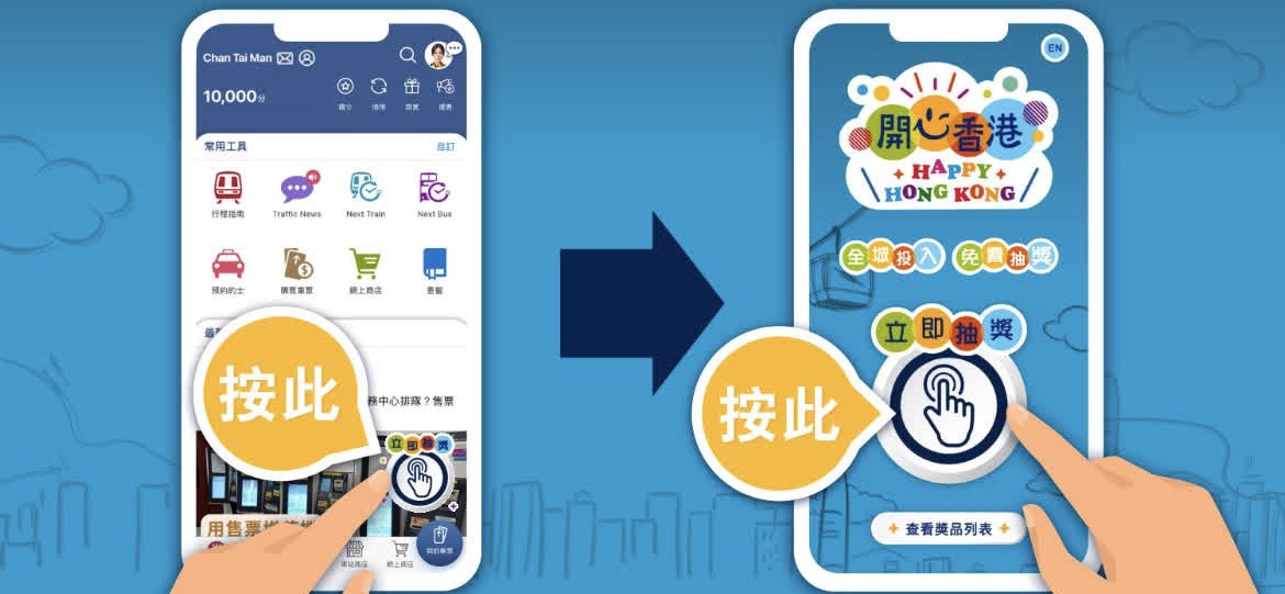 香港新聞網6月13日電 據點新聞報道,為響應“開心香港”活動,港鐵MTR Mobile今日(13日)起一連30日推出“一撳即獎”,每日送5000份獎品,包括全年免費車票、車程優惠、購物禮券及昂坪360纜車門票等!