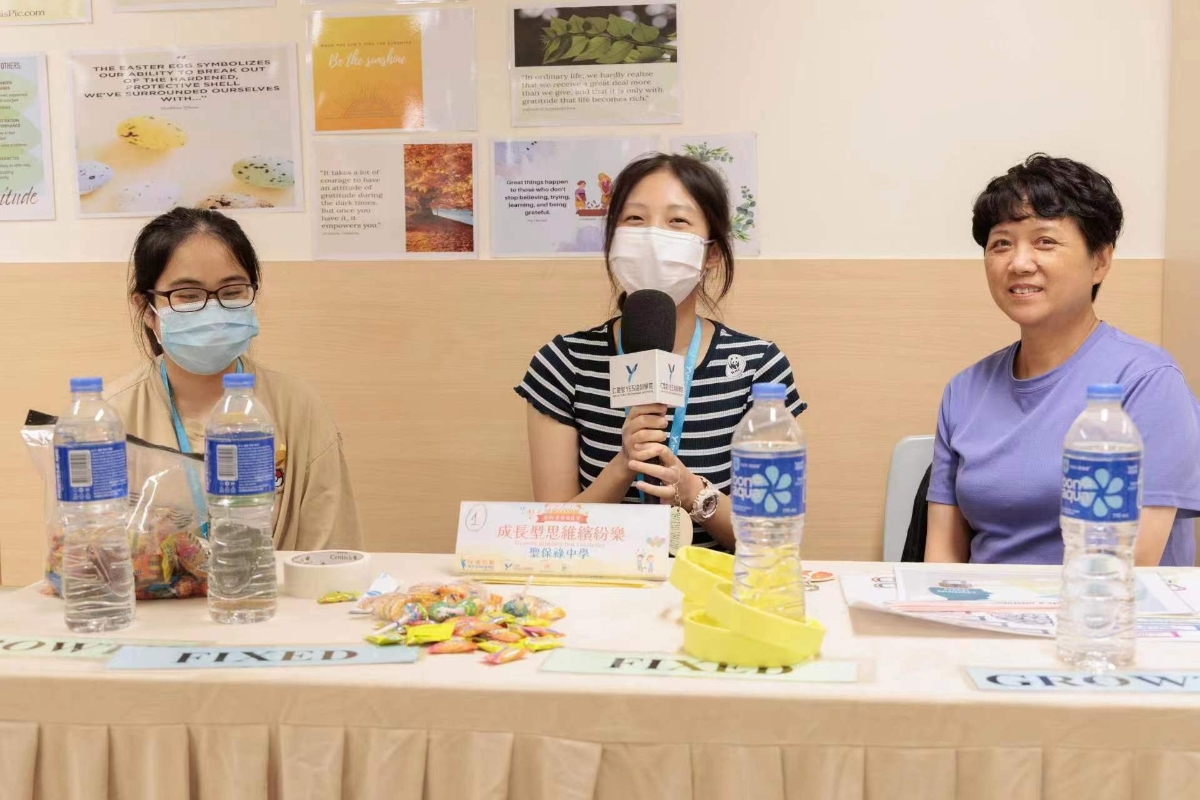 聖保祿中學陸泳桐同學(中間)分享,很高興見到大家踴躍參與,並希望他們的攤位活動能將正向心態帶給更多小朋友。