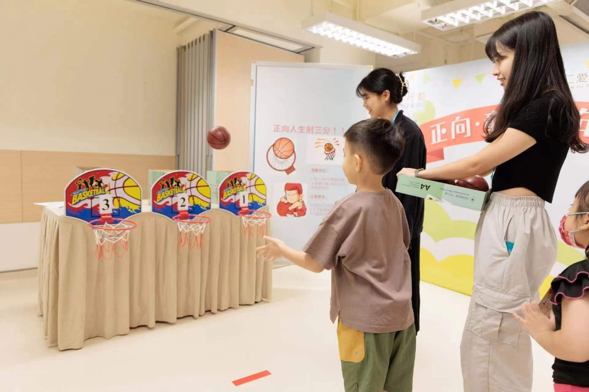 “攤位:正向人生射三分 –小朋友成功地將籃球投進籃框,就像訂立目標一樣” 【編輯:洪少葵】