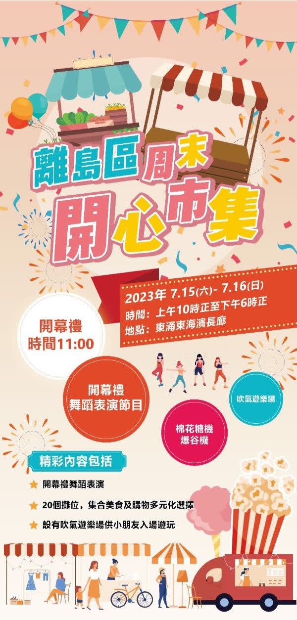 開心市集海報。圖源:香港食環署 今次周末市集設有20個攤位,有棉花糖機和爆谷機等,集合美食及購物多元化選擇,包括遊戲和購物等各式各樣的攤位,為市民提供周末消閒好去處。7月15日上午11時舉行的開幕禮有舞蹈表演節目,今次市集還設有吹氣遊樂場供小朋友入場。 “離島區周末開心市集” 日期:7月15日和16日 時間:上午10時至下午6時 地點:東涌東海濱長廊 【編輯:王軼南】