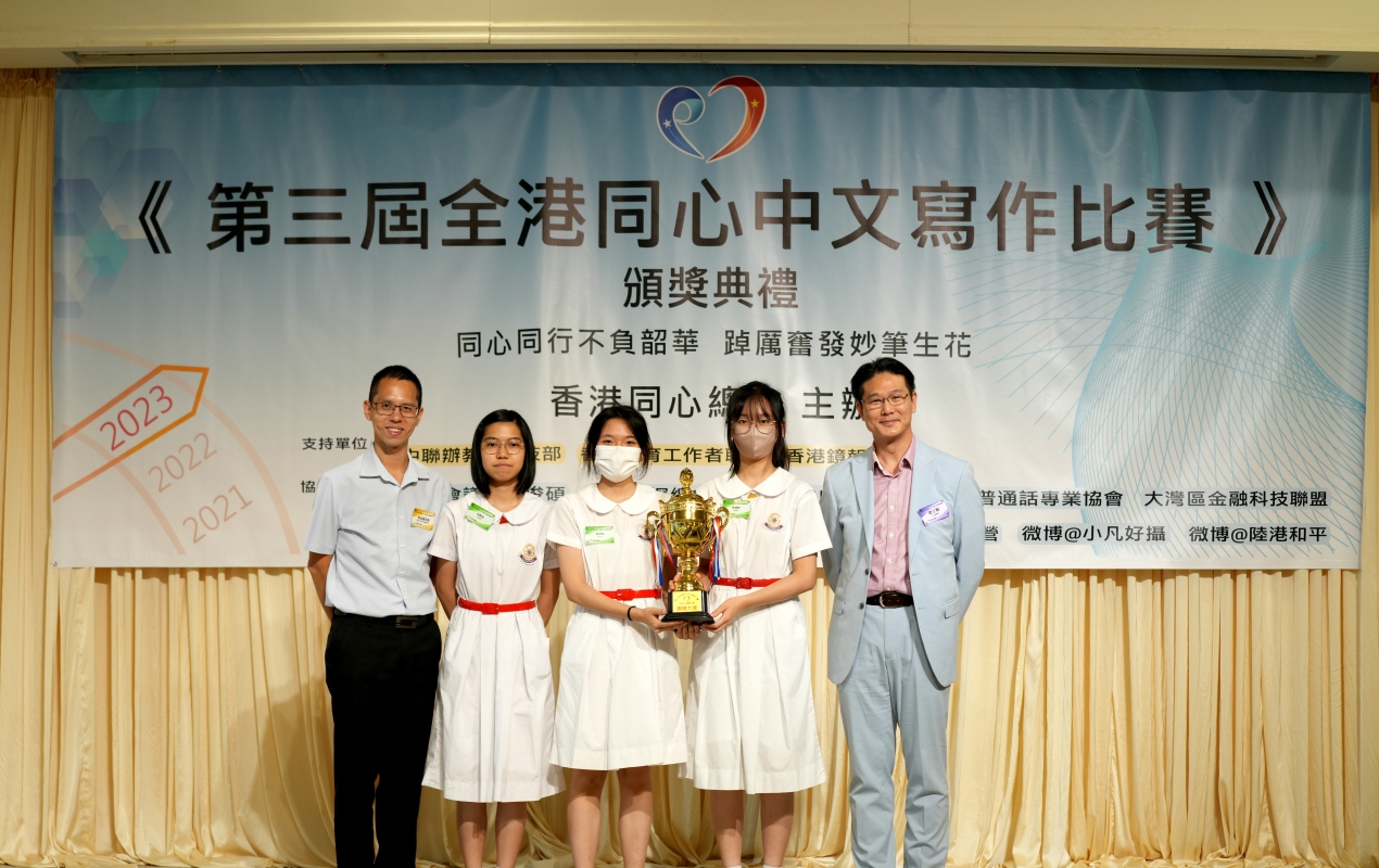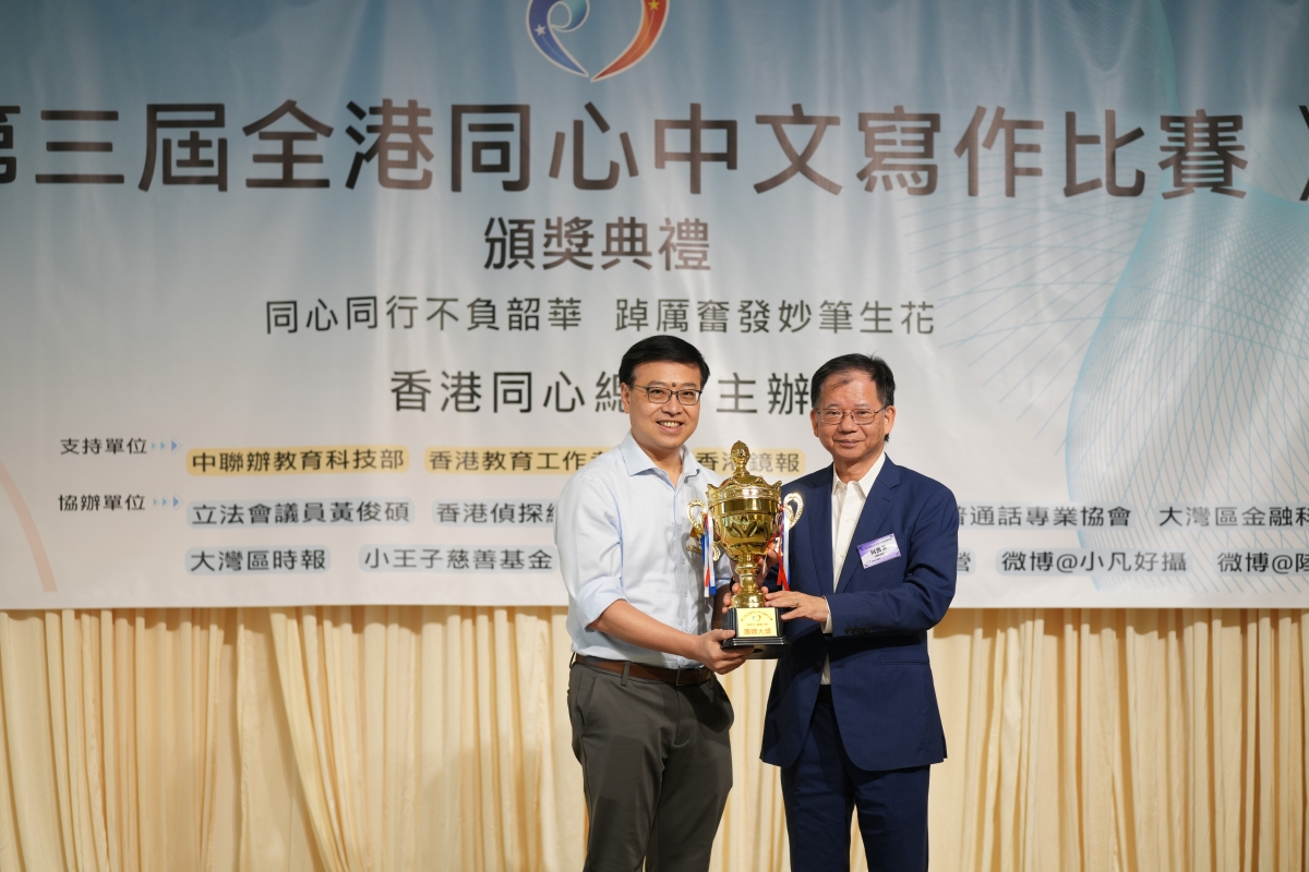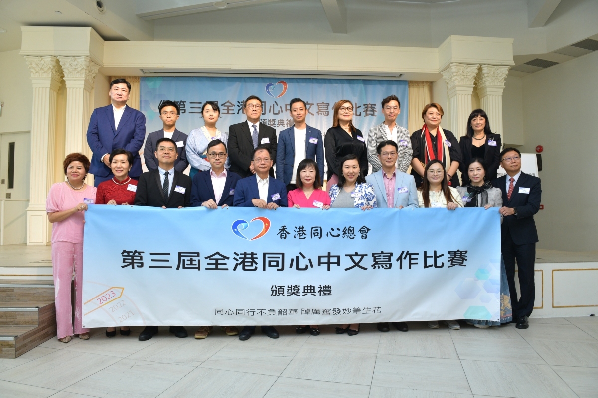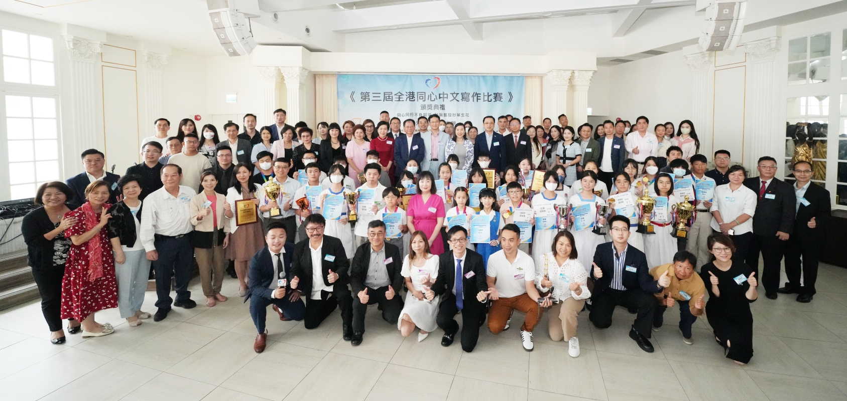 香港同心總會主辦的《第三屆全港同心中文寫作比賽》頒獎典禮於7月30日在九龍灣國際展貿中心舉行。比賽主題“同心同行不負韶華 踔厲奮發妙筆生花”。主辦方收到了來自100多間學校,其中包括多間大專院校學生的投稿,比賽評出了小學組冠軍候依諾、初中組冠軍申奧瑩,高中組冠軍張量淇,公開組冠軍李毅衡,網上最受歡迎獎潘欣悅,獲獎學生共80人,獲團體奬學校14間,其中北角蘇浙公學、仁濟醫院陳楚思中學、東華三院甲寅年總理中學分別贏得團體大奬。 比賽評判有立法會議員鄧飛、林琳,香港青年大專學生協會執委會副主席穆家駿,專欄作家鄭久慧,傑出商界女領袖張曉琴,同心系列作家陳秀貞等。支持單位包括中聯辦教育科技部、香港教育工作者聯會、香港鏡報等。 出席的頒獎嘉賓有國史教育中心校長、全國政協委員何漢權,立法會議員兼評判林琳,立法會議員黃俊碩,立法會議員梁子穎,中聯辦新界工作部黃展豪,香港選舉委員會委員、全國婦聯特邀代表張心瑜院士,專欄作家鄭久慧,傑出商界女領袖張曉琴,香港同心總會會長閔玉玲,同心系列作家陳秀貞,工聯會副總幹事姜淑敏,仁濟醫院行政總裁梁偉光,網絡紅人工作者協會主席高松傑,香港偵探總會會長何國光,香港普通話專業協會主席靳彤彤,新界主場NTT Media總監司徒朗謙,陸港和平青年會常務副會長敖淑婷,領域集團行政總裁 甄景康,柔氣人間身心靈中心創辦人 餘昀曉,華寶貨運有限公司董事長莊華籌等多個協辦單位及贊助單位代表。 全國政協委員、國史教育中心校長何漢權表示,有些獲獎者去了外遊,仍派家人或老師出席代領,很難得。他也好欣賞主辦方對社會的付出,2013年習近平主席已經提出,中國的傳統文化十分重要。全世界最獨特的文字就是中國文字,單音單字,最適宜敘事、口耳相傳、我手寫我心,好寶貴的。他呼籲明年有更多人參加香港同心總會舉辦的中文比賽。 中聯辦新界部代表黃展豪表示:主辦方的主題好好,是一個愛國主義徵文比賽,不單是學生,是做了一件利國利民利香港的大好事。學生在構思作文之時,認識了國家的歷史和香港的發展。有很多學生在文筆中流露了對國家的真摮情感,更加熱愛民族、熱愛國家、熱愛香港。 香港同心總會會長閔玉玲表示,該會盼望透過優美的文字,鼓勵社會上各界人士,尤其年青人,同心同行、踔厲奮發、篤行不怠。舉辦頒獎典禮,是希望能夠表彰、鼓勵學生及優秀的作者,繼續發揮創意和智慧,保持他們對中文寫作的興趣。最後她也表示希望下一屆有更多的學校學生參與,大家能夠同心協力,將中國文化傳播到全世界。