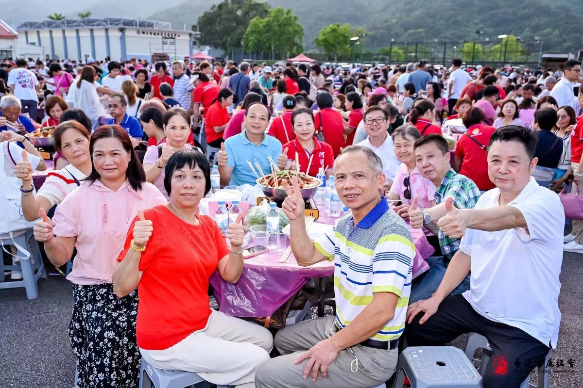 客家鄉親在林村盆菜宴上合照。圖源:香港商報 客屬總會執行主席曾智明表示,香港客屬總會一直以“愛國愛港愛家鄉”為宗旨,號召客家人投入各項社會工作和活動。在每年特區政府的授勳名單中,都會看到香港客屬總會和各團體會員首長、成員的身影,這是對香港客家人貢獻的一大肯定。他提到,今年客屬總會的榮譽主席張國榮獲頒授金紫荊星章,值得慶賀。過去幾年,客屬總會的首長及成員一直盡己所能,為市民和地區服務,同心抗疫,有多位成員亦獲得特區政府勳函。他表示,今次舉辦盆菜宴慶祝活動,向獲授勳的成員送上祝賀,以表揚他們的貢獻和成就,希望大家能以他們為榜樣,繼續發光發熱,獻出客家人的力量。
