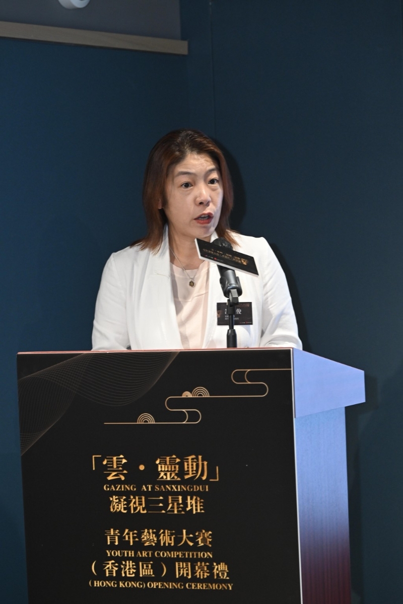 王嘉恩致歡迎辭 香港特區政府民政及青年事務局青年專員陳瑞緯先生致辭時表示,三星堆作為中國古代文明的瑰寶之一,蘊含著深厚的歷史和文化底蘊。“透過參賽者的創作,我們可以看到他們對這個古老文明的理解和詮釋,這無疑是一個展現青年藝術才華的絕佳機會”。