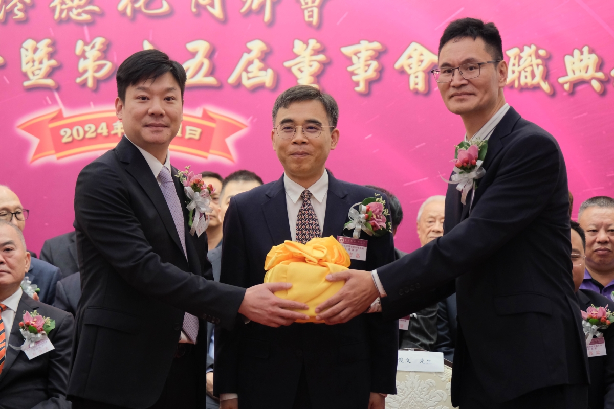中聯辦社聯部部長鐘吉昌(中)、香港德化同鄉會第14屆會長顏俊文(左)、新當選的香港德化同鄉會第15屆董事會會長徐中膺