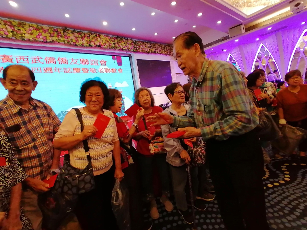 香港廣西武僑僑友聯誼會會長余瑞源、僑界領袖王欽賢為78歲以上的僑友們頒發禮物和紅包