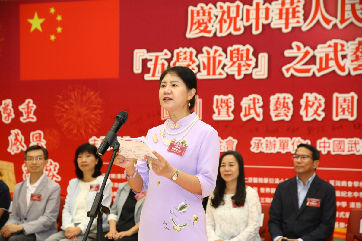 冯燊均国学基金会主席鲍俊萍女士 馮燊均國學基金會是著名慈善家馮燊均先生與其夫人鮑俊萍女士於2008年共同成立的公益慈善組織,歷年捐資內地及香港各著名高校,得到國家、特區政府和香港社會的認同,是香港和內地傳承國學、致力教育、立德樹人的中堅。 近年該會特別關注國學在基礎教育階段的發展,提出“五學并舉”主張,以“經典”、“歷史人物”、“禮儀”、“武藝”、“書法”作為學習國學的入門及愛國教育的必要基石。 “2024慶祝國慶75周年,五學并舉之武藝校園計劃-武藝操大匯演”由香港特區政府教育局、 民政及青年事務局作為支持單位,并由馮燊均國學基金會主席、香港教育大學榮譽院士鮑俊萍女士主持。 主禮嘉賓還包括香港立法會議員朱國強校長; 香港立法會議員周文港博士; 港區全國人大代表淩友詩博士; 馮燊均國學基金會董事李雄溪教授; 武藝校園計劃總監、中國武術國際學院黃宇帆院長。擔任本次大匯演主禮嘉賓的還有參加大匯演的20所學校校長。連同學生家長到場打氣,本次參與大匯演活動的人數逾700人。