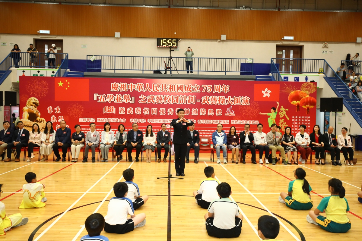 “五學并舉”之武藝校園計劃 - 武藝操大匯演暨武藝校園優秀教師頒獎典禮舉行香港新聞網10月27日電 慶祝國慶75周年,香港五學并舉之武藝校園計劃-武藝操大匯演”暨武藝校園計劃優秀教師頒獎典禮,於10月27日在香港林士德體育館隆重舉行。 大匯演由推廣國學教育的團體馮燊均國學基金會主辦,中國武術國際學院承辦,24所中小學(包括特殊學校)共400名學生參加。 匯演體現文化自信和國家認同,香港中小學生共同以中國武術精神為強大祖國獻禮致敬。