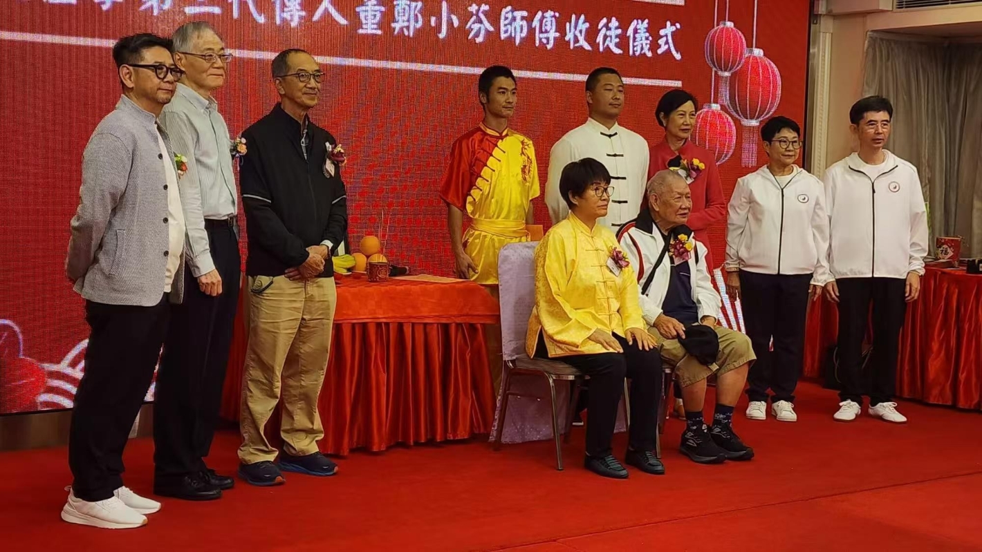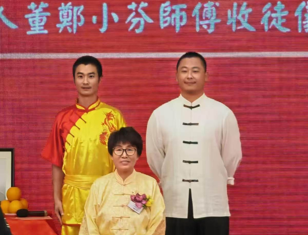 董鄭曉芬師傅收徒儀式上和徒弟鄒鵬(左)臧文龙(右)