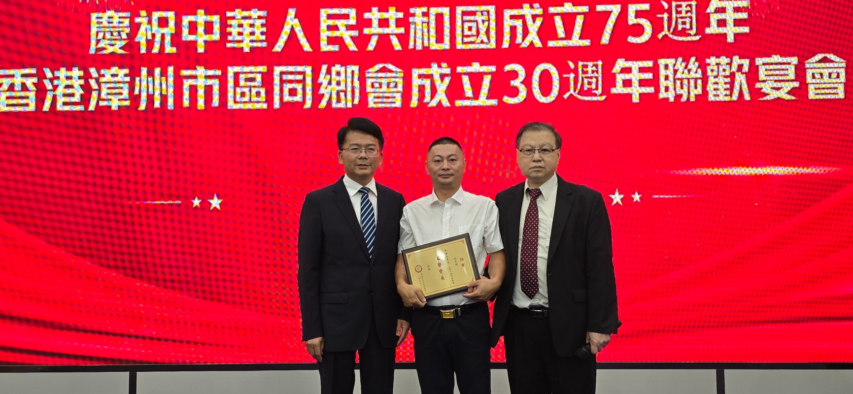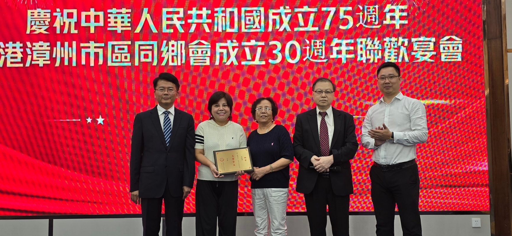 香港新聞網11月19日電 香港漳州市區同鄉會於11月17日在深圳國匯大酒店舉行“慶祝中華人民共和國成立75 周年暨香港漳州市區同鄉會成立30周年聯歡宴會”,漳州市薌城區委常委魏毅坤、區委統戰部副部長、僑辦主任楊文璐,區僑聯主席李至淩,區商務局副局長吳國智、區海外聯誼工作服務站站長施蔚,區統戰部辦公室主任莊鴻專程出席祝賀。