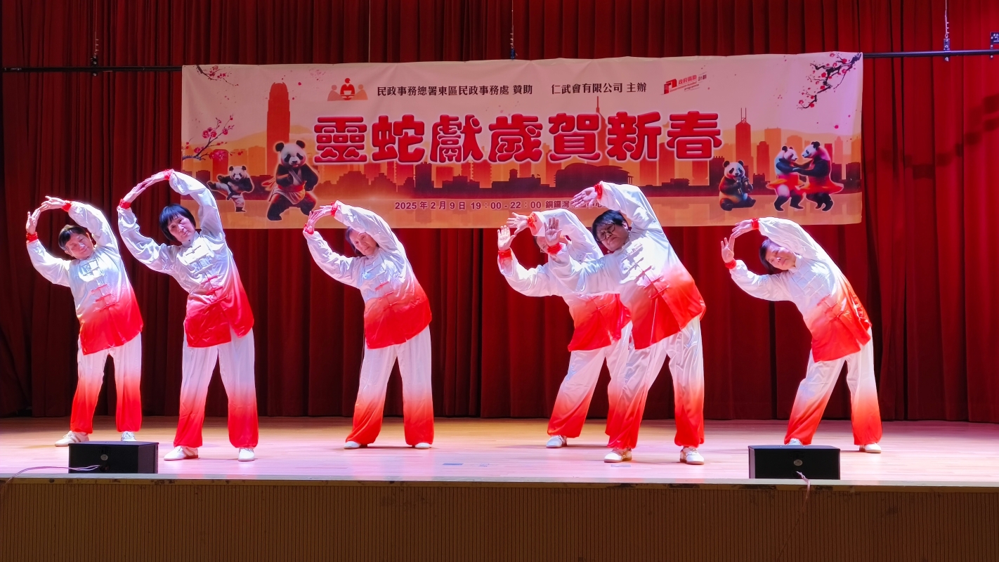 武出健康太極協會的太極新編⼗三式 仁武會主席嚴義松致辭,他向大家送上新春祝福,祝大家蛇年身體健康,事事如意!並表示:仁武會做為一個慈善基金機構,成立十多年,過去幾年積極參與社區健康活動推廣,除了開辦各種健康講座,還委派教練到不同機構及社區進行免費教學,提高大眾的健康意識。今次活動更得到民政事務總署東區民政事務處提供的贊助,使仁武會得已舉辦成立以來的首次賀新春晚會,同東區市民同樂,共賀新春。 主禮嘉賓東區區議員洪志傑議員致辭:很榮幸受到仁武會邀請參加賀歲晚會,祝大家新年“靈蛇”健康、“靈蛇”快樂,他知道當晚節目非常豐富,有武術、舞蹈和演唱,可以做到“靈蛇”唱得、“靈蛇”打得、“靈蛇”睇得,並恭祝大家新年進步,萬事勝意!