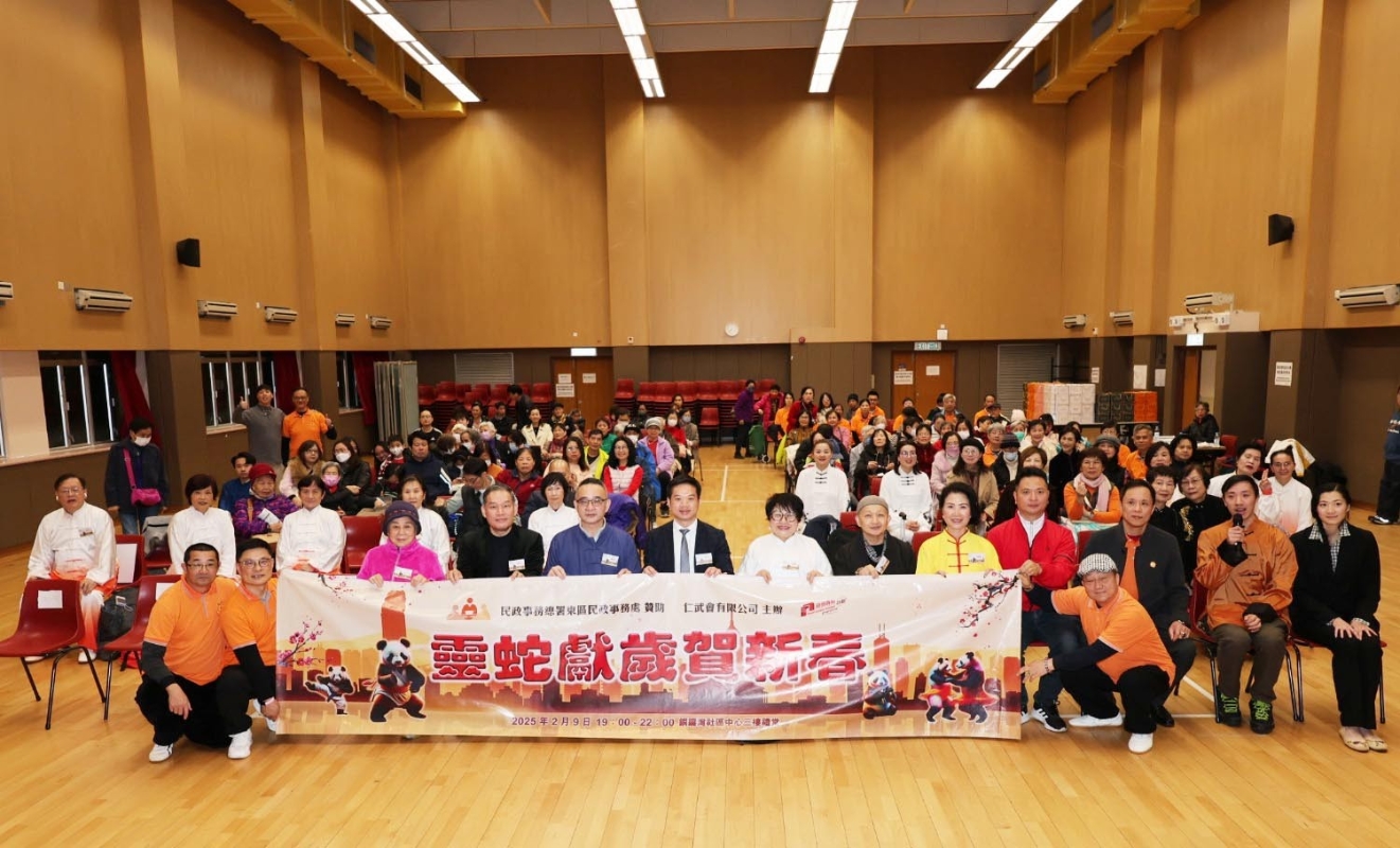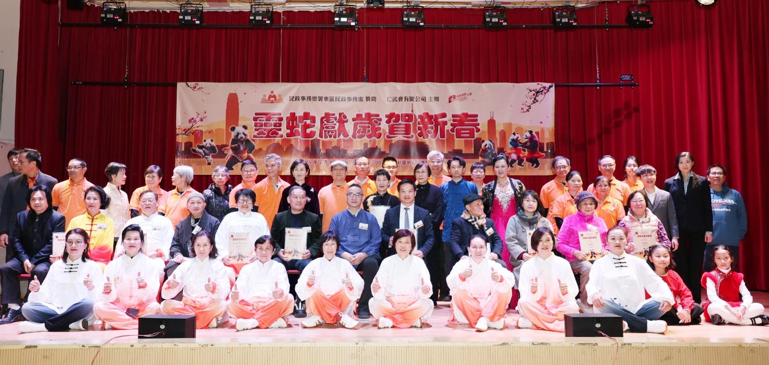 香港新聞網2月11日電 由香港仁武會主辦、民政事務總署東區民政事務處贊助的“靈蛇獻歲賀新春”2月9日晚假銅鑼灣社區會堂舉行,主禮嘉賓東區區議員洪志傑、香港閩清同鄉聯誼會會長黃挺光、漳州市武術協會副會長洪少葵、香港安溪同鄉會董事兼教練潘慧君、武出健康太極協會會長廖蘭香、長征藝術團團長趙汝彬、香港文善社創辦人楊淇煜、香港光澤聯誼會榮譽顧問蔡元芳及月兔信貸陳燕堂董事出席了活動。