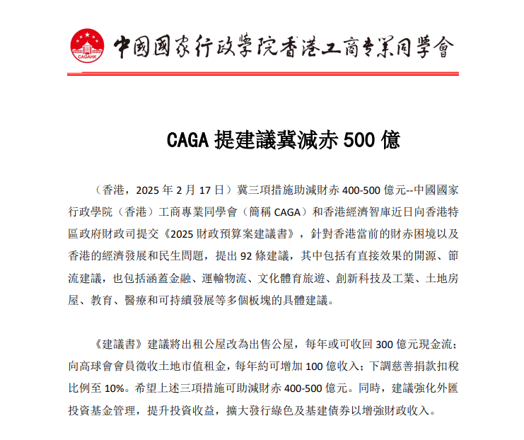 香港新聞網2月17日電 中國國家行政學院(香港)工商專業同學會(簡稱CAGA)和香港經濟智庫近日向香港特區政府財政司提交《2025財政預算案建議書》,針對香港當前的財赤困境以及香港的經濟發展和民生問題,提出92條建議,其中包括有直接效果的開源、節流建議,也包括涵蓋金融、運輸物流、文化體育旅遊、創新科技及工業、土地房屋、教育、醫療和可持續發展等多個板塊的具體建議。 《建議書》建議將出租公屋改為出售公屋,每年或可收回300億元(港元,下同)現金流;向高球會會員徵收土地市值租金,每年約可增加100億收入;下調慈善捐款扣稅比例至10%。希望上述三項措施可助減財赤400-500億元。同時,建議強化外匯投資基金管理,提升投資收益,擴大發行綠色及基建債券以增強財政收入。