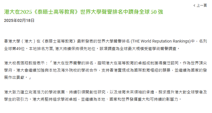 港大校長張翔表示,港大在世界聲譽的排名,證明港大在高等教育的卓越成就獲得廣泛認同。作為世界頂尖學府,港大會繼續加強與本地及海外院校的學術合作,支持香港實現成為國際教育樞紐的願景,並繼續為國家的發展作出貢獻。 港大致力建立充滿活力的學術氛圍、持續引領開創性研究,以及培育未來領袖的承擔,務求提升港大對全球學者及學生的吸引力。港大將堅持追求學術卓越,並繼續為本地、國家和世界發揮重大和可持續的影響力。 (完) 【編輯:譚暢】