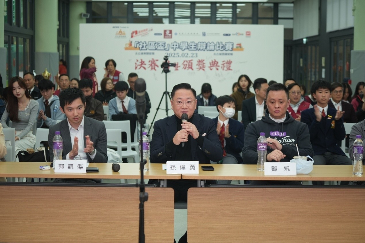 辯論賽現場氣氛熱烈,代表正方的英皇書院認為,政府主導“關愛隊”能夠確保服務的全面性和公平性,而且可以發揮更強大的調動能量,在社區遇上緊急情況時可以發揮最大功效。而中國婦女會中學則持相反觀點,認為政府主導可能會抑制社會組織的積極性和創新性,導致服務內容單一、缺乏靈活性,他們認為“關愛隊”應更多地依靠社會力量和社區自組織來運作,這樣能夠更好地滿足居民多樣化的需求,同時培養居民的責任感和歸屬感。 由港區全國人大代表孫偉勇、立法會議員鄧飛、團結香港基金副研究總監郭凱傑、政治學者葉振東博士及香港中華書局副總編輯吳黎純等五人組成的評判團給予嚴謹評分及深入點評。孫偉勇表示,全國人大代表的層面並非只討論國家大事,關心社區也是工作範疇,特別他自己也是“東區友”,同意同學所說的“社區無小事”,認為“社區盃”鼓勵同學就社區議題發表意見,深入思考,十分值得推廣。曾在大學時代創下50場不敗紀錄的鄧飛議員,本身也是資深辯論員,在演辯技巧上給予了很多寶貴意見。葉振東博士與郭凱傑先生同樣有豐富的辯論經驗,葉博士提醒同學在資料蒐集時要深入且準確,而郭先生則建議同學應在辯論邏輯上加強功夫。