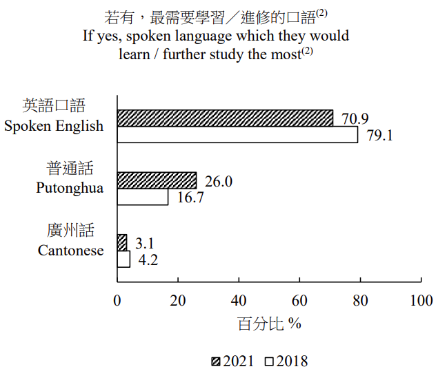 調查顯示:2021年,香港人認為最需要進修普通話的比例較2018年上升,英語則相應下跌。(圖源:香港特區政府統計處)