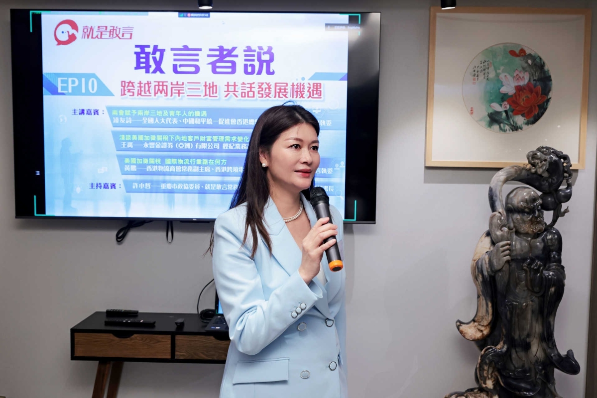 重慶市政協委員、“就是敢言”常務副主席許小哲 活動由重慶市政協委員、“就是敢言”常務副主席許小哲主持。她指出,在美國加徵關稅的全球挑戰下,各界都很關注政府後續會採取哪些具體措施穩定市場,降低關稅對金融市場和相關產業的影響,在協助受影響的中小企業應對成本上升、市場份額縮減等問題上,有哪些金融扶持政策,兩岸三地要把握國家政策紅利,加強交流合作,助力貿易企業轉型,開拓新興市場,並引導金融資源流向高增值創新驅動產業。