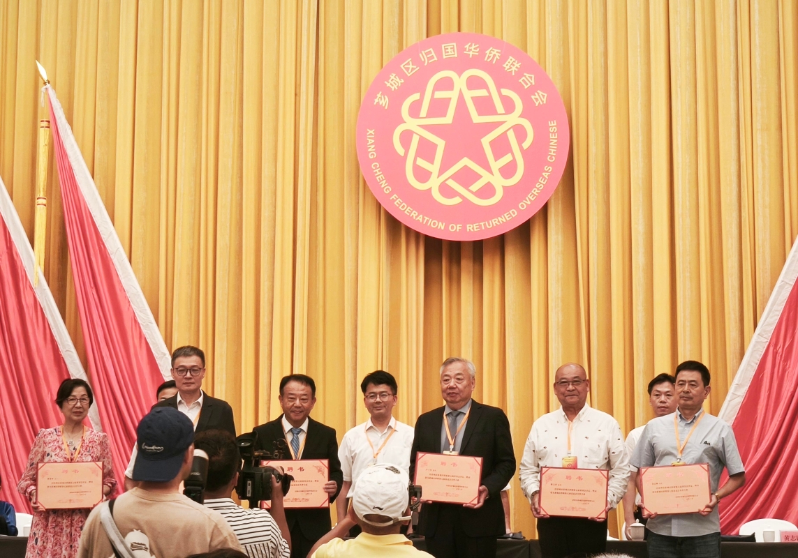 薌城區僑聯主席李致淩(左三)主持頒發榮譽主席聘書給予林廣兆、陳清泉、郭國耀、林紹奮先生,分別由余敏(左)、莊子傑(右)、林素珍女士(右三)、林素英女士(左二)、張海雄(右二)代領。