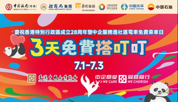 慶回歸28周年暨中企服務進社區活動 全港市民3天免費搭電車香港新聞網7月2日電 為慶祝香港回歸祖國28周年, 積極響應香港特區政府“拼經濟,謀發展,惠民生”的目標,在“全城慶祝、與眾同樂”的喜慶氣氛裏,香港中國企業協會攜手會員企業於7月1日開始一連3天(7月1日至3日)邀請全港市民免費搭乘香港電車,並於7月1日舉行電車免費搭乘活動啟動禮,與市民一起感受共慶回歸的喜悅氣氛,搭載香港夢想駛向未來。此慶祝活動由香港中國企業協會發起組織 ,與中旅集團、華潤集團、招商局集團、中國銀行(香港)、中國太平、中國石油等中資企業聯合主辦。 電車免費搭乘活動啟動禮1日在干諾道西屈地街電車總廠隆重舉行;由特區政府民政及青年事務局局長麥美娟女士,中聯辦港島工作部副部長尤斌先生,中企協會會長、中旅集團董事長王海民先生,中企協會副會長兼總裁于曉先生,中企協會副會長、華潤集團副總經理藍屹先生,中企協會副會長、招商局集團副總經理鄧仁杰先生,中企協會副會長、中銀香港副總裁王化斌先生,中企協會副會長、中國石油香港總經理蔣奇先生,中國太平保險集團領導焦艷軍先生擔任主禮嘉賓, 共同為活動主持啟動儀式。出席本次啟動禮的還有:光大集團副總經理,光大香港董事長兼總裁于法昌先生、中企協會副總裁曾燊典先生、灣仔區民政事務專員張雁伶女士、中企協會執董,燕山發展總經理曹欣先生、立法會議員嚴剛先生、陳振英先生、李浩然先生、姚柏良先生、陳沛良先生、簡慧敏女士、譚岳衡先生等。