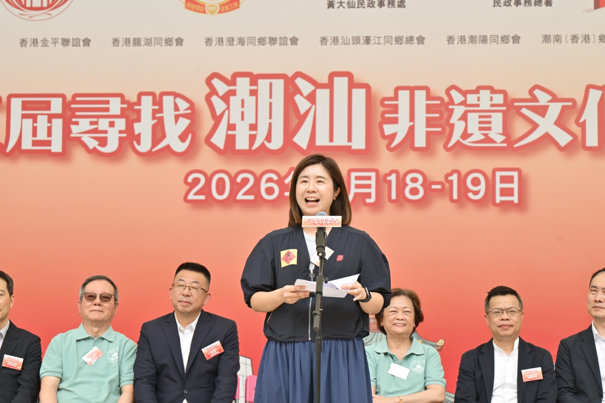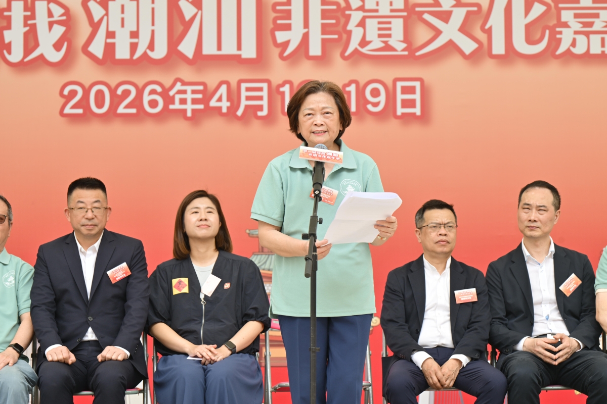 署理民政事務總署署長王婉蓉女士致辭 香港汕頭社團總會主席、香港潮州商會會長高佩璇博士致辭時表示,潮汕非遺文化承載千年傳承,凝聚海內外潮汕兒女的智慧與情懷。她希望通過此次活動,讓香港市民在手藝、味道與故事之間,感受潮汕文化的溫度與豐富底蘊。