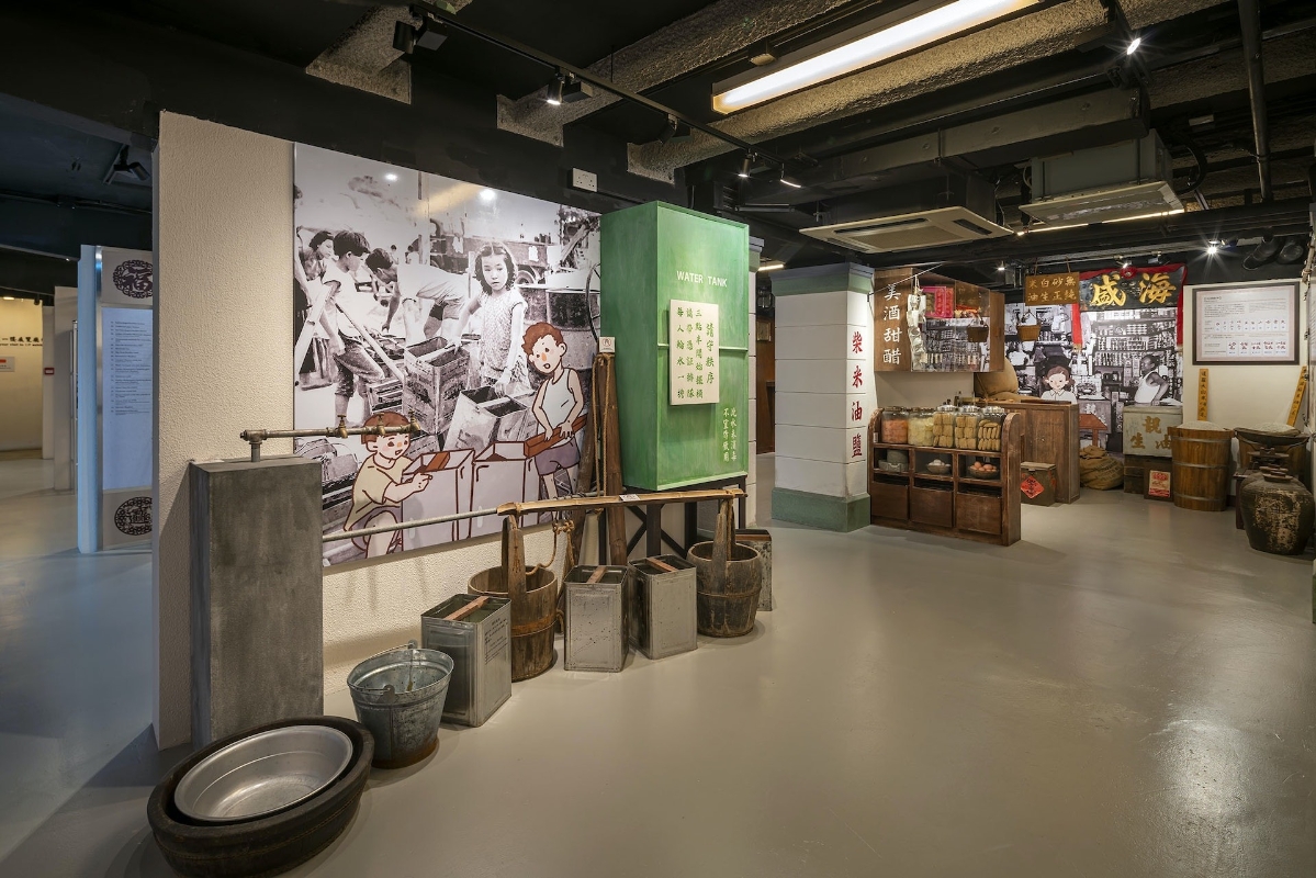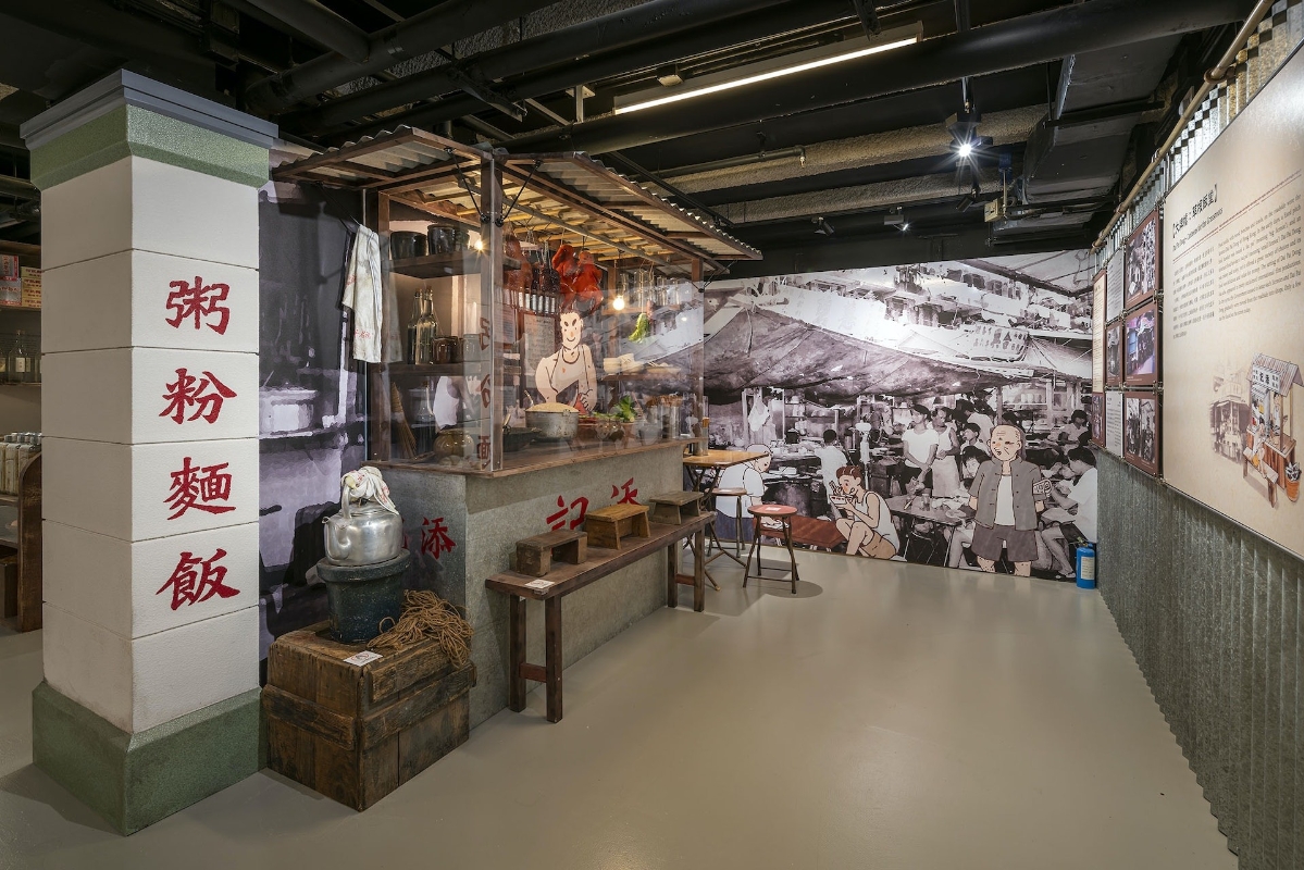 懷舊餐廳 “歲月留情”展覽分為兩層,新設地下展廳分成十個主題展區,展示雜貨舖“糴米”、“飛髮”、制水時期“擔水”、大牌檔“食嗱喳麵”、遊樂場“彈波子”、“跳大繩”等街坊日常生活場景。
