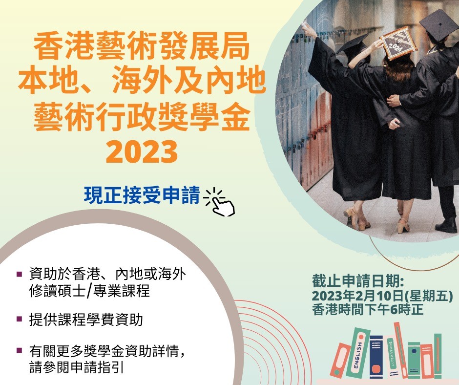 “本地藝術行政獎學金2023” 申請資格:該計劃支持具備最少2年受薪藝術行政工作經驗的藝術行政人員修讀由本地大專院校舉辦為期1年以上、與藝術行政相關的碩士/專業課程或與商業管理相關的專業課程,擬報讀的課程須於2023年4月1日至2024年3月31日期間開課。 獎學金資助金額:每位獲選者可獲所選課程學費資助,上限為HK$100,000。藝發局預計將頒發約5個獎學金。 “海外及內地藝術行政獎學金2023” 申請資格:該計劃支持於藝文界具備最少3年受薪工作經驗的藝術行政人員修讀海外或內地認可院校開辦與藝術行政相關的授課式碩士課程,擬報讀的課程須於2023年8月1日至2024年7月31日期間開課。 獎學金資助金額:每個獎學金主要津貼獲選申請者1張來回機票、生活費及課程學費等開支,資助上限為HK$450,000,最終發放的獎學金將按獲選者所選課程學費及就讀國家/地區訂定資助金額。藝發局預計將頒發約5個獎學金。 申請方法及截止日期 申請者可於藝發局網站下載申請指引及表格(點此下載)。申請者須於香港時間2023年2月10日(星期五)下午6時正前將一份完整填妥的申請文件(包括填妥及簽署的申請表格和所需文件〔除推薦信外〕)經下列其中一個途徑提交: i) 經電郵發送至ts_submission@hkadc.org.hk;或 ii) 投進設於藝發局辦事處(香港鰂魚涌英皇道1063號10樓)的申請收集箱內;或 iii) 以郵寄至藝發局(香港鰂魚涌英皇道1063號10樓) 電郵或信封註明“本地藝術行政獎學金2023”或“海外及內地藝術行政獎學金2023”。郵寄申請以郵戳為準。申請者只須透過上述任何一個方式遞交申請。逾時提交、以傳真或上述電郵外其他電子方式遞交的申請將不獲處理。 查詢電話2827 8786或電郵至hkadc@hkadc.org.hk與藝發局辦事處聯絡。 【編輯:黃璇】