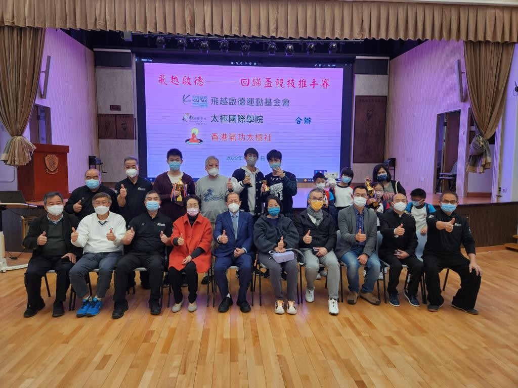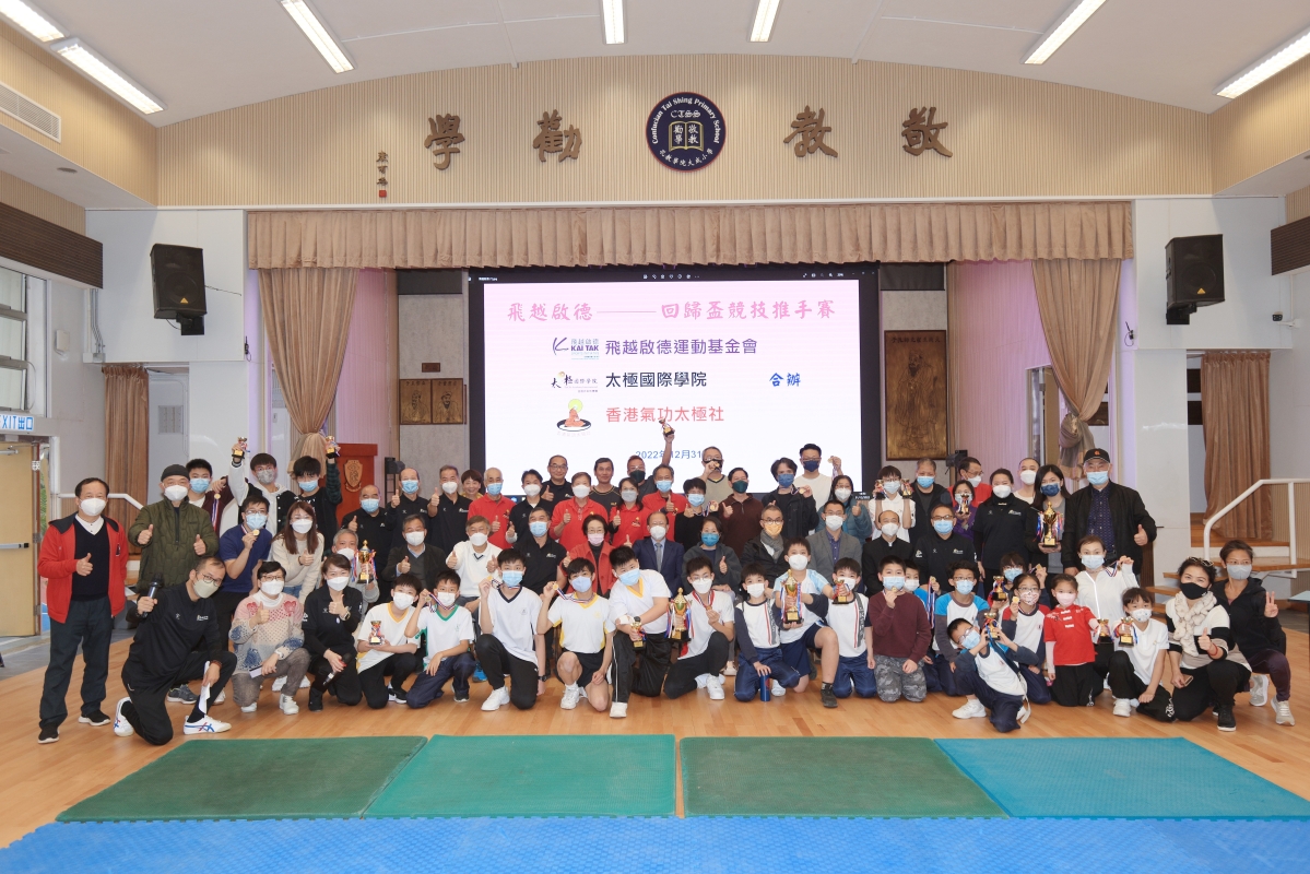 香港新聞網12月31日電(記者許其皓) 12月31日,香港太極國際學院、香港氣功太極社及飛越啟德運動基金會合辦“飛越啟德回歸盃競技推手賽”於黃大仙大成街孔教大成小學舉行,參賽選手經過一番拼搏較量,決出各項賽事獎項。當天出席頒獎的嘉賓包括,太極國際學院主席林文輝、太極國際學院總監貝鈞奇、香港婦女事務事務委員會主席陳婉嫻女士、香港考評局總監麥勁生教授、教聯會總幹事崔劍博士、香港國際武術總會主席冷先鋒、太極國際學院法律顧問劉嘉華律師、太極國際學院顧問李漢源等武術界嘉賓,活動在一派熱鬧氣氛中圓滿結束。