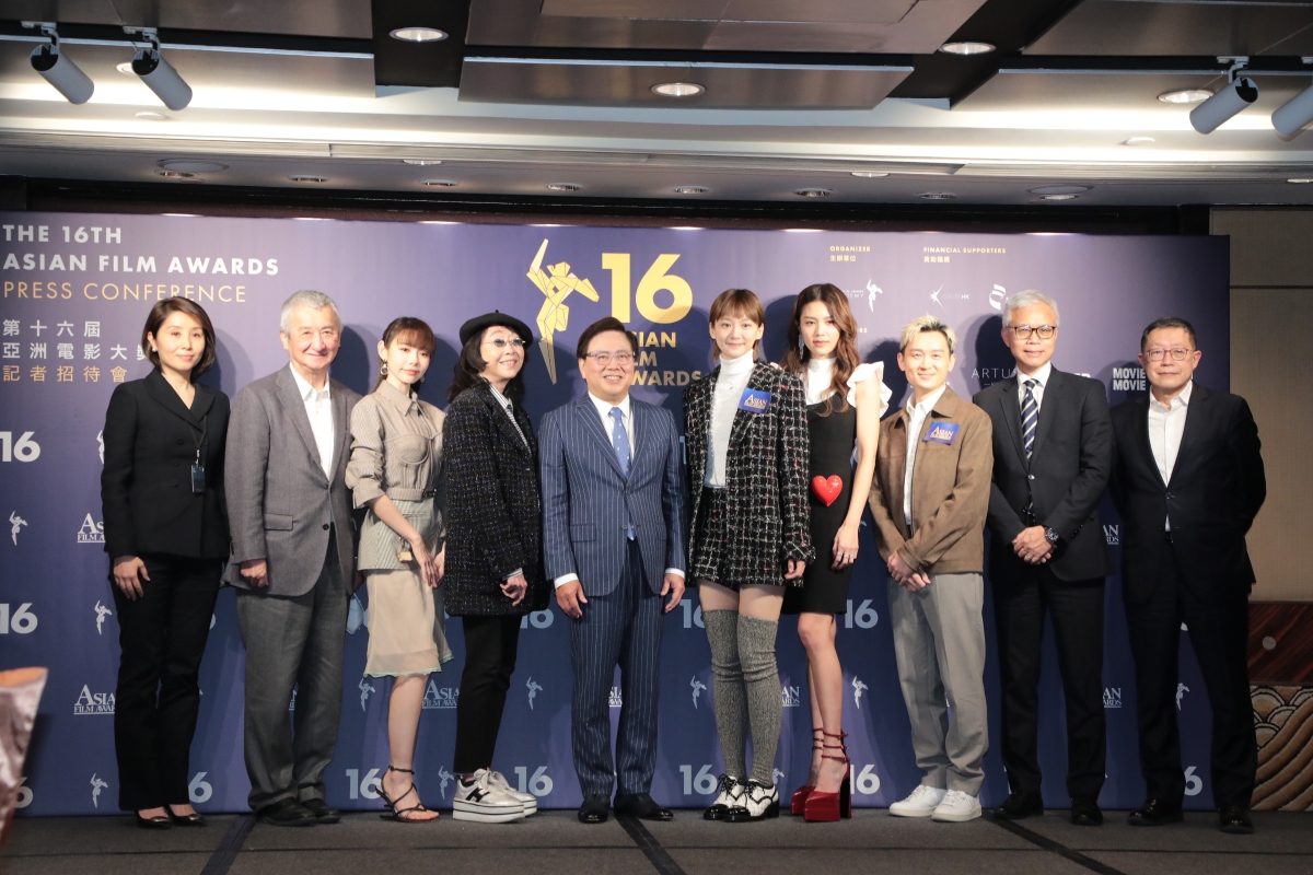 圖為亞洲電影大獎學院主席王英偉博士(左五)、導演張婉婷(左四)、藝人周秀娜(右四)、袁澧林、林明禎、淩文龍等嘉賓出席記者會。