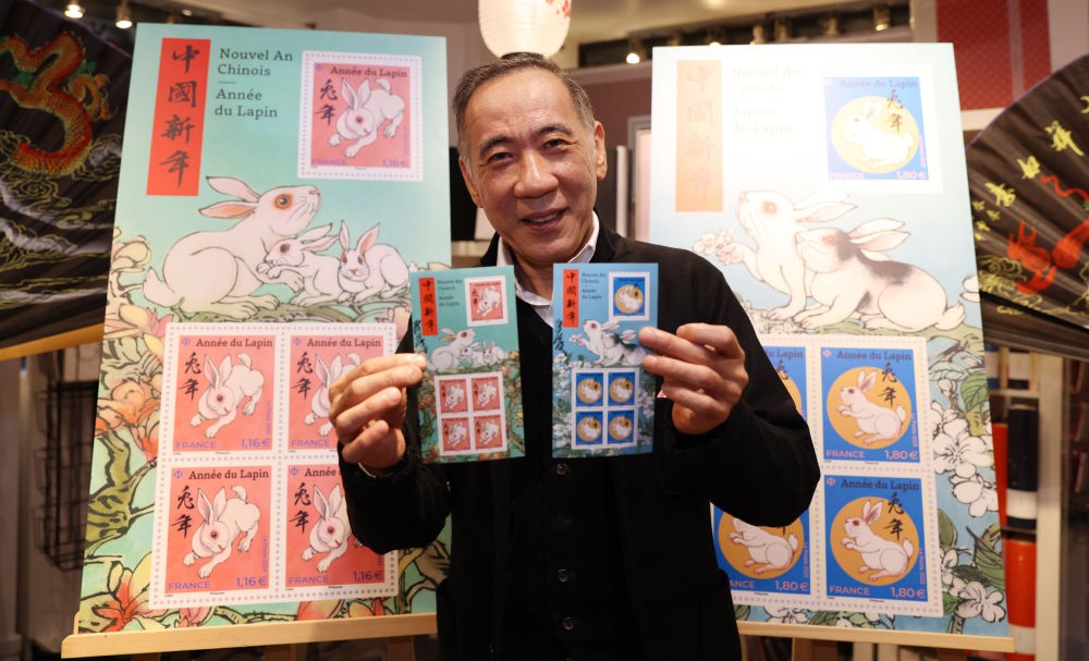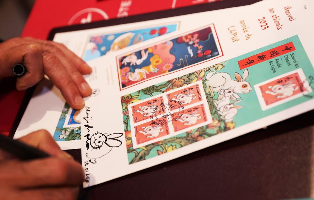 香港新聞網1月16日電 為迎接中國農曆新年,法國郵政近日在巴黎舉行中國兔年生肖紀念郵票發行儀式。中國兔年生肖紀念郵票共兩款,由法國華人藝術家陳江洪(CHEN Jiang Hong)設計。自2019年起,陳江洪已經設計了農曆己亥豬年、庚子鼠年、辛丑牛年和壬寅虎年四套生肖郵票。法國郵政癸卯兔年郵票是他設計的第五套生肖郵票。