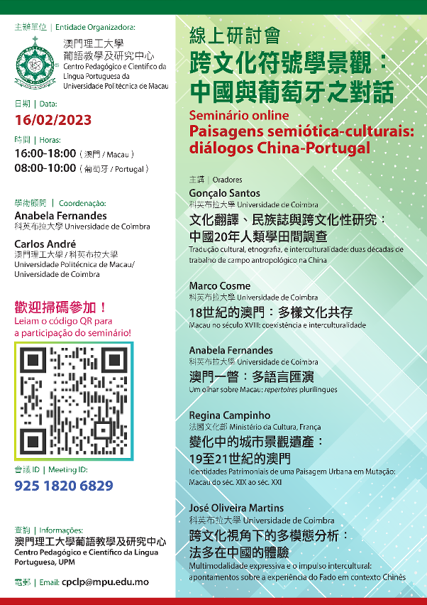 由於澳門獨特的地理位置和歷史背景,澳門文化成為了一種以中華文化為主、兼容葡萄牙文化的具有多元化色彩的共融文化。不同文化在澳門如何彼此相融、和睦相處是一個值得多角度探討的重要議題。 “跨文化符號學景觀:中國與葡萄牙之對話”線上研討會由葡萄牙科英布拉大學文學院助理教授及20世紀跨學科研究中心(CEIS20)研究員阿納貝拉·費爾南德斯(Anabela Fernandes)和澳門理工大學名譽教授及科英布拉大學文學院前院長卡洛斯·安德烈(Carlos André)擔任學術顧問。會議將從語言、歷史、藝術等多角度分析探討澳門的中葡文化交融與共存。 本次線上會議將邀請來自葡萄牙和法國的五位知名專家學者擔任主講嘉賓,其中貢薩洛·桑托斯(Gonçalo Santos)將從文化翻譯、民族誌和跨文化研究角度介紹討論中國20年間的人類學田間調查;馬爾科·科斯梅(Marco Cosme)將介紹分析18世紀澳門的多樣文化的共存;阿納貝拉·費爾南德斯(Anabela Fernandes)將研究並探討澳門的多語言現;雷吉納·坎皮諾(Regina Campinho)將介紹19至21世紀變化中的澳門城市景觀遺產;若澤·馬丁斯(José Martins)將從跨文化視角下進行多模態分析,介紹葡萄牙民族音樂法多在中國的體驗。 “跨文化符號學景觀:中國與葡萄牙之對話”線上研討會於澳門當地時間2月16日下午4時(葡萄牙時間2月16日上午8時)透過線上方式進行,現誠摯歡迎各位師生、中葡專家學者及感興趣人士掃碼參與。詳情可聯絡澳門理工大學葡語教學及研究中心,電郵cpclp@mpu.edu.mo。 【編輯:黃璇】
