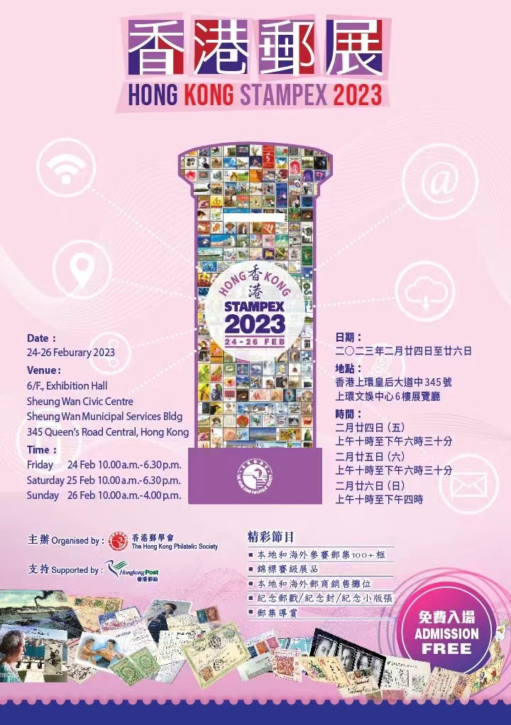 “香港郵展 2023”海報 香港郵展 2023 地點:上環文娛中心6樓展覽廳(香港上環皇后大道中345號) 日期及時間:2月24及25日 上午10時至下午6時30分;2月26日 上午10時至下午4時 入場費:免費入場 【編輯:黃璇】