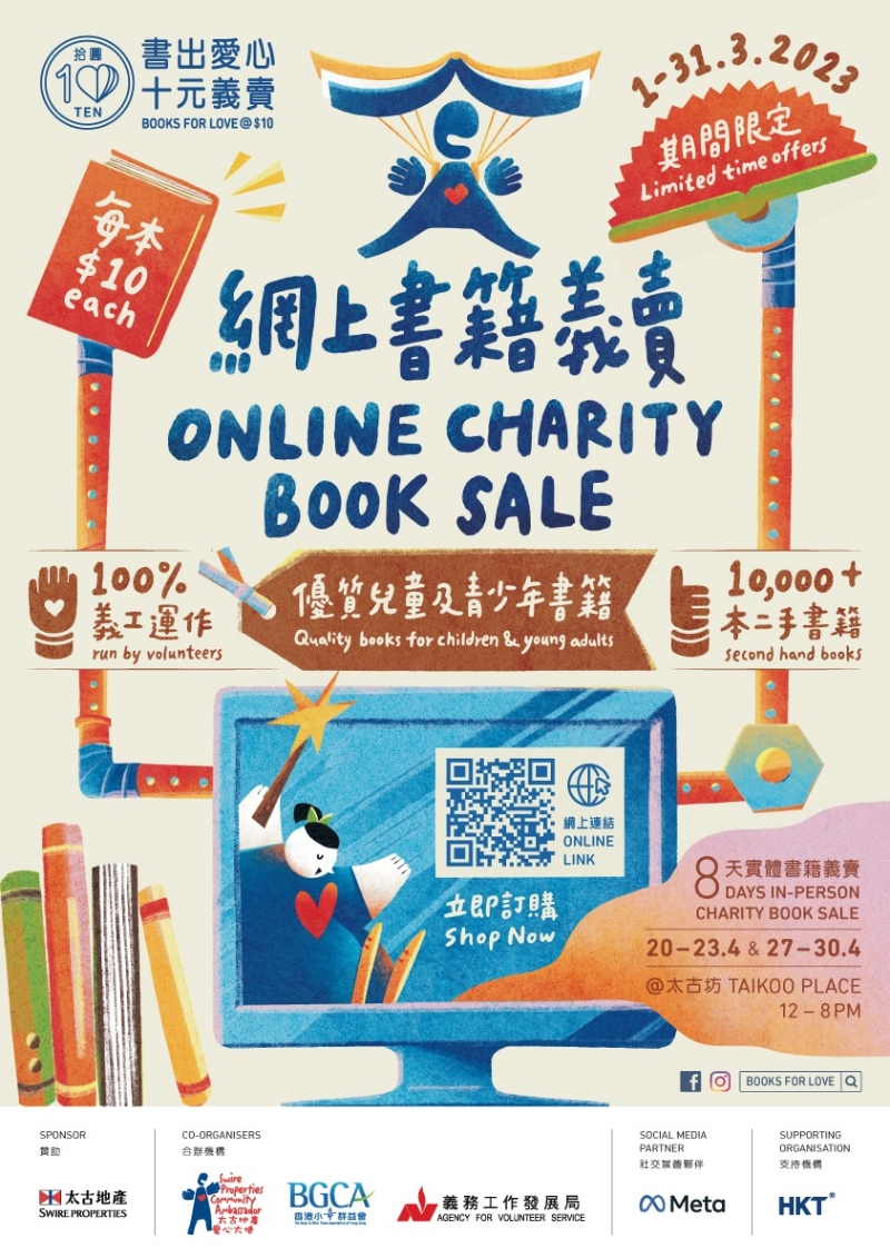 太古地產“書出愛心.十元義賣”是香港每年備受矚目的社區文化盛事。今屆在一月份內合共收集逾25萬本捐書。從2009年至今已踏入第十一屆,去年破紀錄籌得超過100萬港元。今年實體書籍義賣為期8天,分別在4月20至23日,以及4月27至30日於鰂魚涌太古坊舉行。是項活動籌得的善款將悉數用作支持香港小童群益會的“群益寶庫”計劃,以及義務工作發展局推動義務工作的持續發展。
