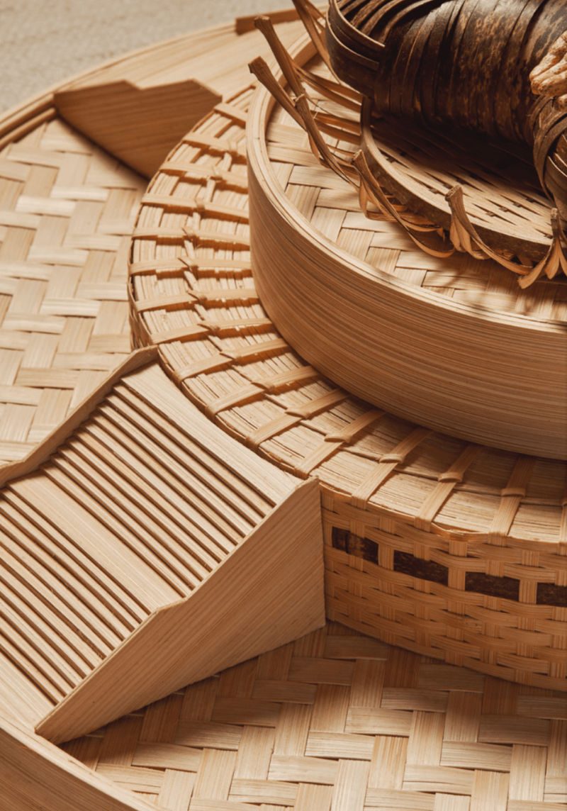 《一帆風順》 此外,林昆佑及林繁盛又共同創作以不同種類的本地木材,配上漆藝和雕刻製作而成的中式屏風系列《從前、以後》。 由當代工藝師黎潤詩和陳郁共同創作,以藍染製作的裏襯而製成的藤製行李箱《飄泊——時、地、人》。