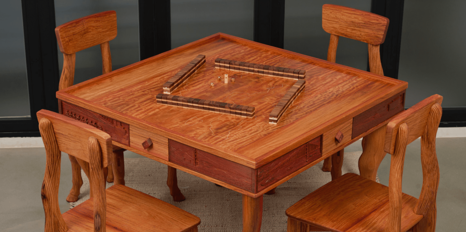 《漂泊——時、地、人》 由傳統木工雕刻工藝師蕭炳強師傅和當代工藝師周健龍共同創作,以榫卯工藝組裝的四張手工雕刻椅子和一張麻將枱《飛躍奔騰》。